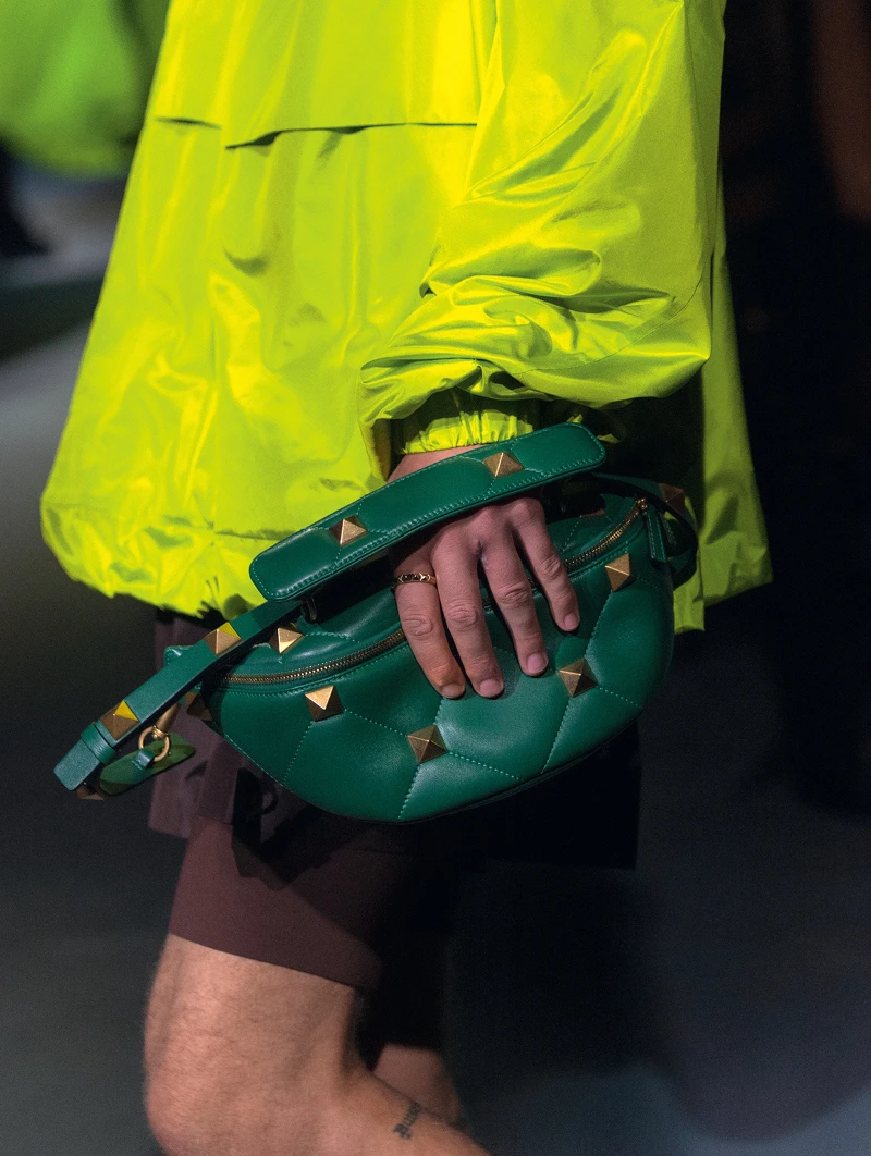 因為前述的服飾豐富的造型性,包包的部分,Valentino多改以精簡四方的輪廓來呈現,斗大的鉚釘金釦展現品牌個性。