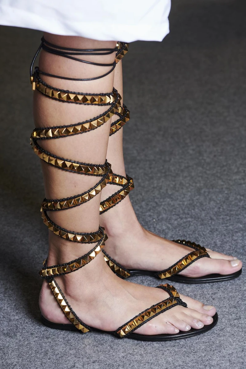 春夏來一雙應景的涼鞋是必須的,而在這一季Valentino特別選擇及膝的羅馬涼鞋作為主打款,夾腳的鞋頭以品牌的招牌鉚釘點綴。