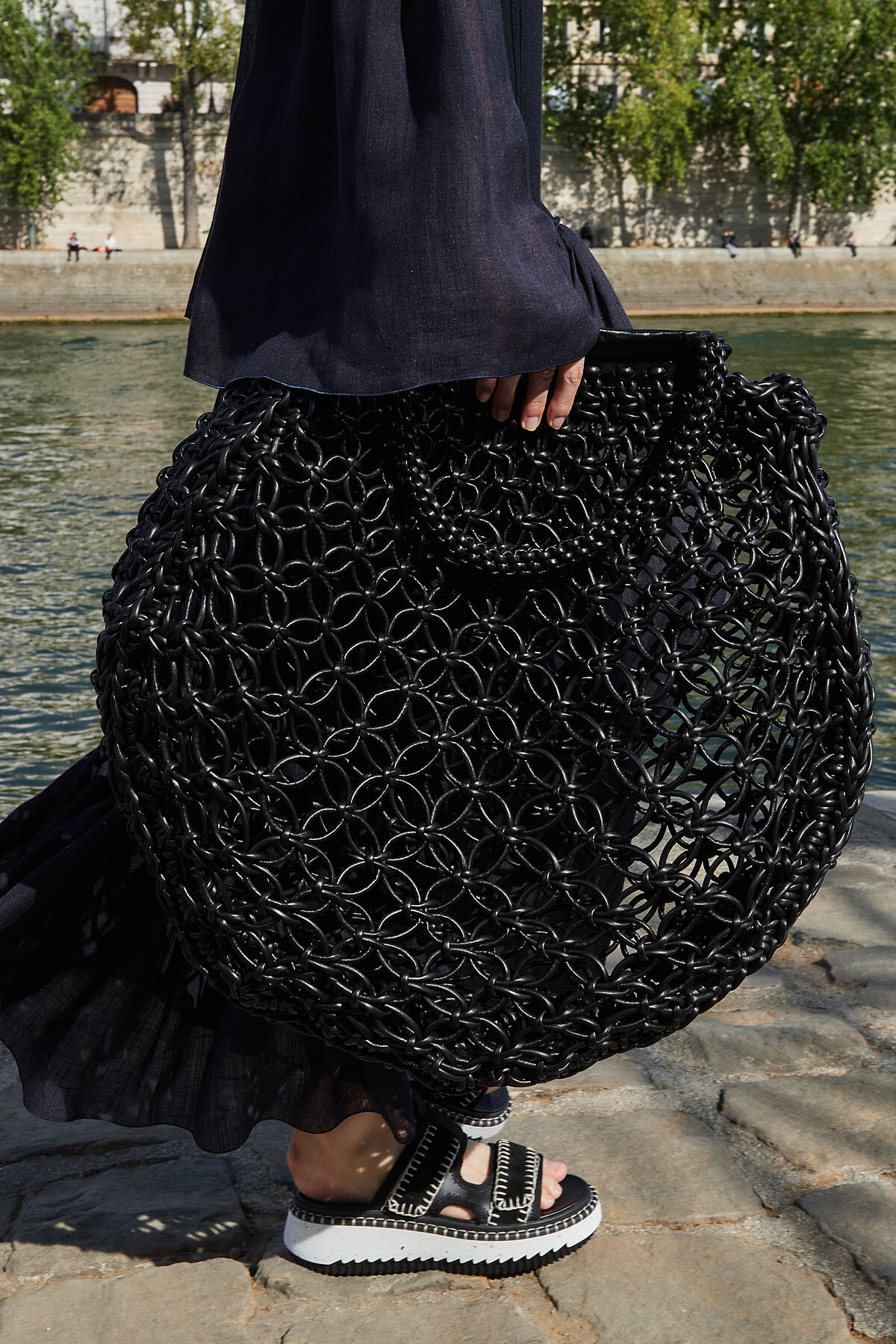 漁網狀的編織包,在提把的地方採用皮革面料拼接製作,讓編織包有了不一樣的氣質。