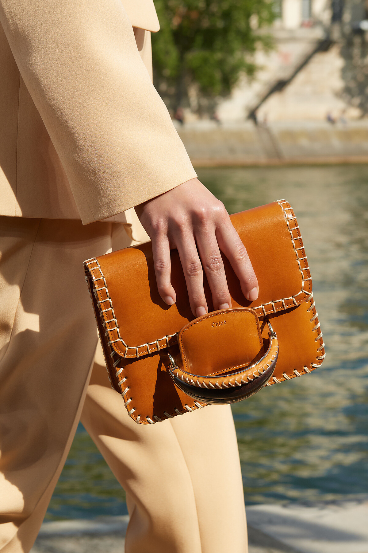 回歸到前言所提到的簡約風格,Chloé再融進自家的品牌風格——方正的Kattie手拿包,包包的邊緣以針織毯縫針方式裝飾,皮革和縫線之間有著撞色的活潑感;提把部分又透過金屬與木頭的異材質拼接,簡單的輪廓卻又藏有許多設計巧思。