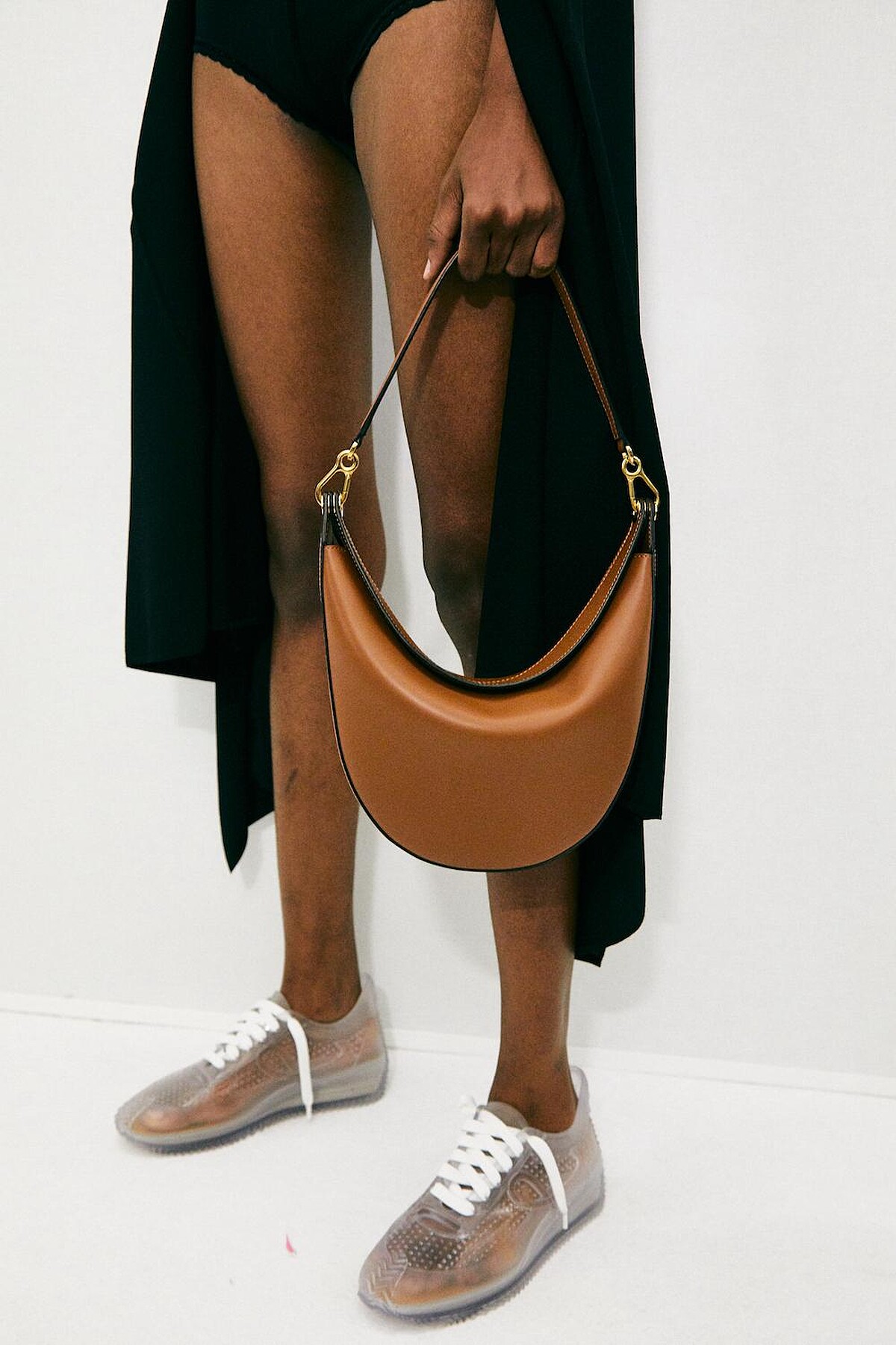有別於前兩款的簡約調性,迪奧今年秀上還有這一款帶有運動風的迷你提袋,半月形的輪廓,包包底部附有4個釘腳。