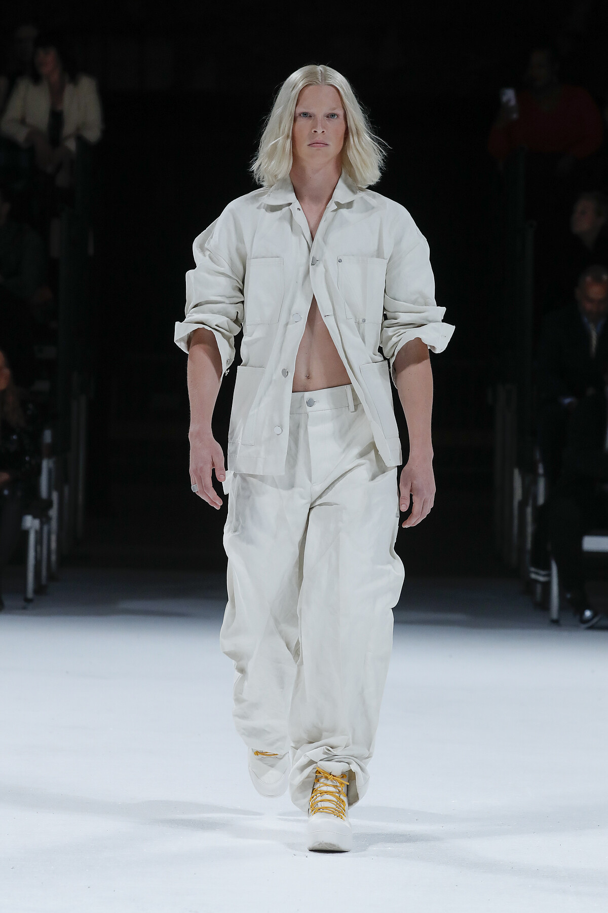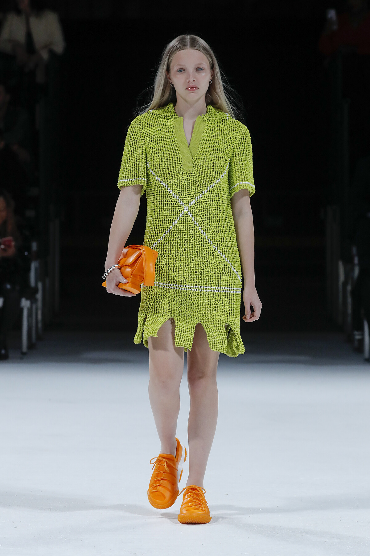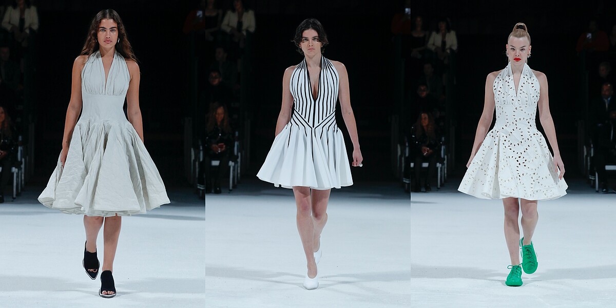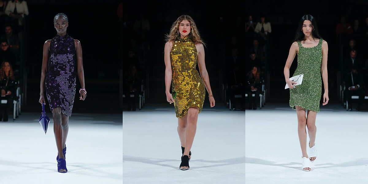 除了休閒元素,Daniel Lee也從舊時好萊塢取材,在女裝的部分使用了許多的亮片妝點無袖洋裝,另外還有數款以瑪麗蓮夢露經典的白色洋裝為藍圖所設計的變奏款。
