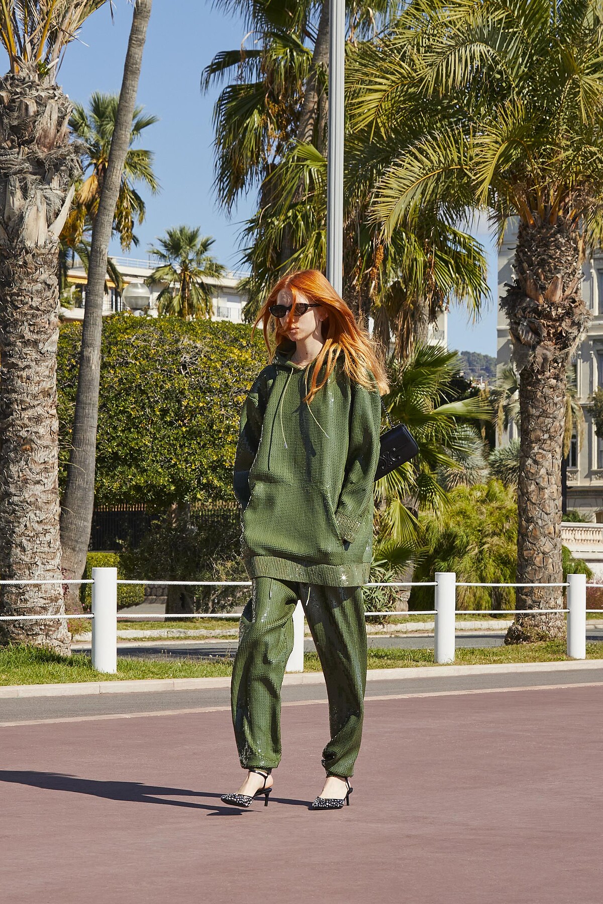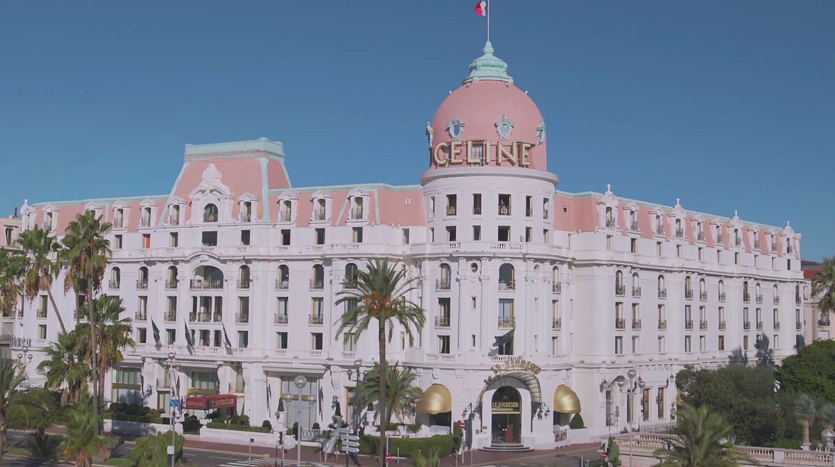 CELINE 2022夏季大秀,選址在法國東南海岸的天使灣,背景出現的是Hotel Le Negresco,帶著《歡迎光臨布達佩斯大飯店》的粉紅夢幻濾鏡,CELINE大手筆地將飯店的招牌換成品牌logo,為大秀揭開序幕。
