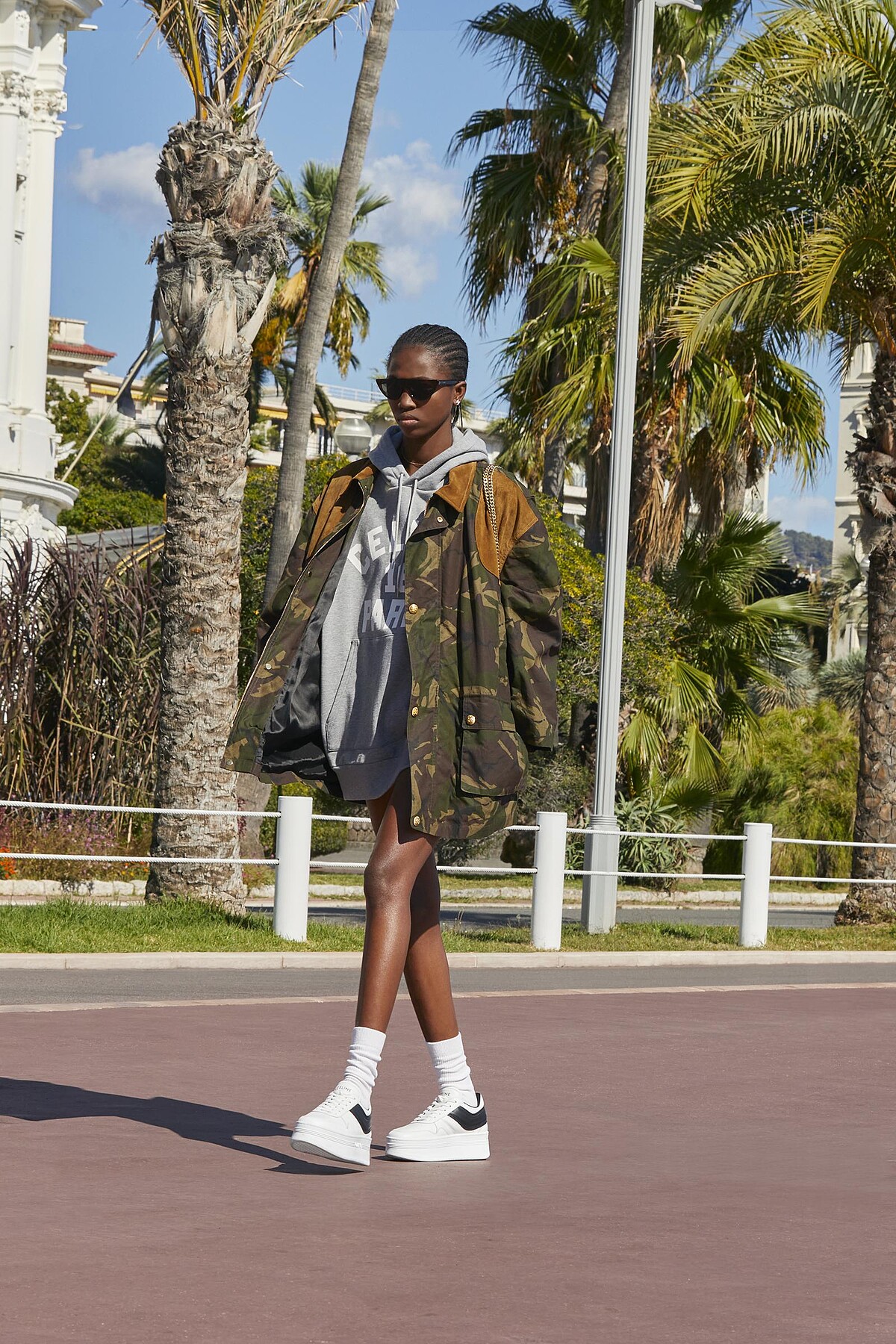 本季大秀高潮,莫過於品牌大使Lisa也加入了伸展台走秀的部分,寬鬆的飛行員外套配上帽T,肩上的檸檬黃綠色Triomphe肩背包更是惹人矚目!