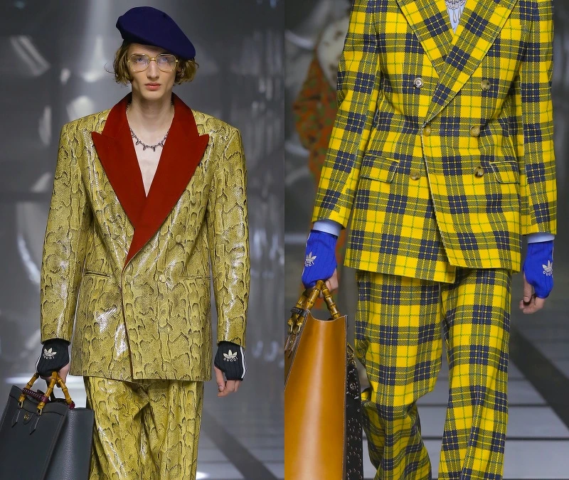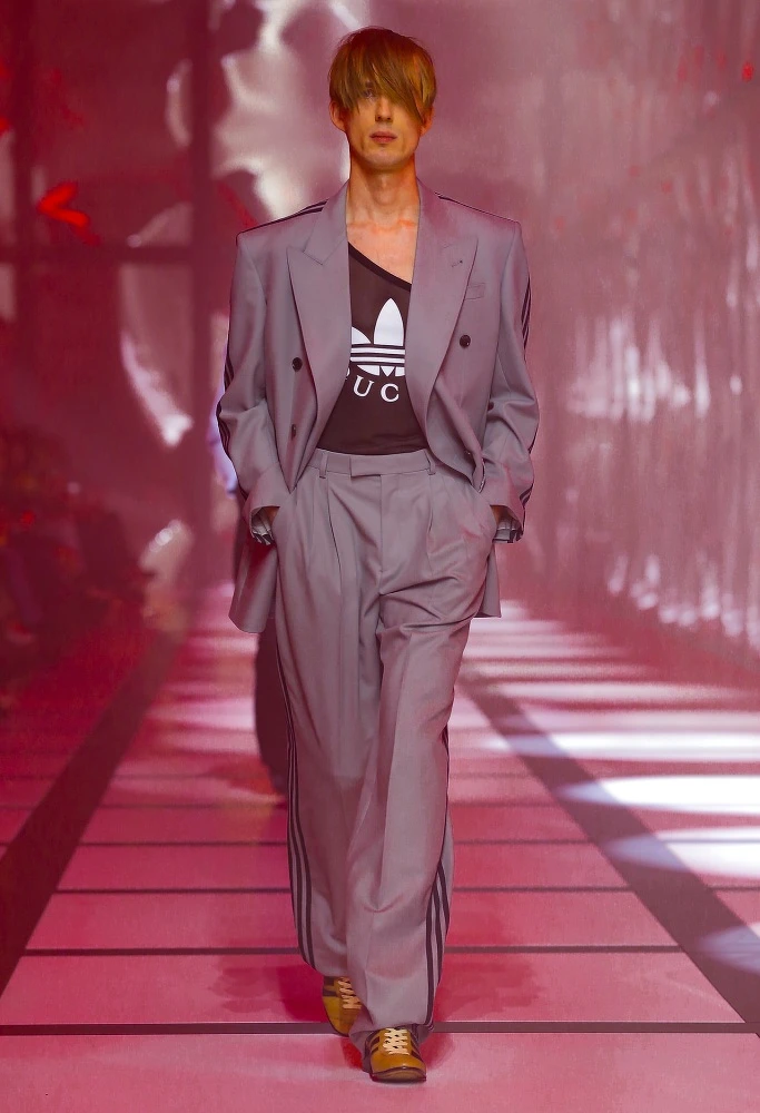 在古馳的秀上看見西裝不稀奇,但看到壓印有adidas經典符碼的西裝外套、西裝長褲,那無疑是一大驚喜,包括各種繽紛色、燈心絨材質還有格紋款。
