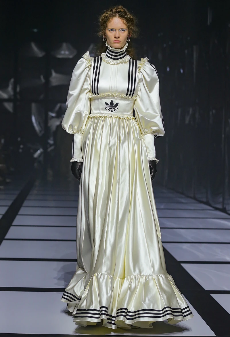 乍看之下,宛如鬼新娘的娃娃裝,選用光澤感的緞面布,將adidas三線標點綴在肩膀、脖子和裙擺處,腰間則印上大大的adidas X Gucci聯名圖案。