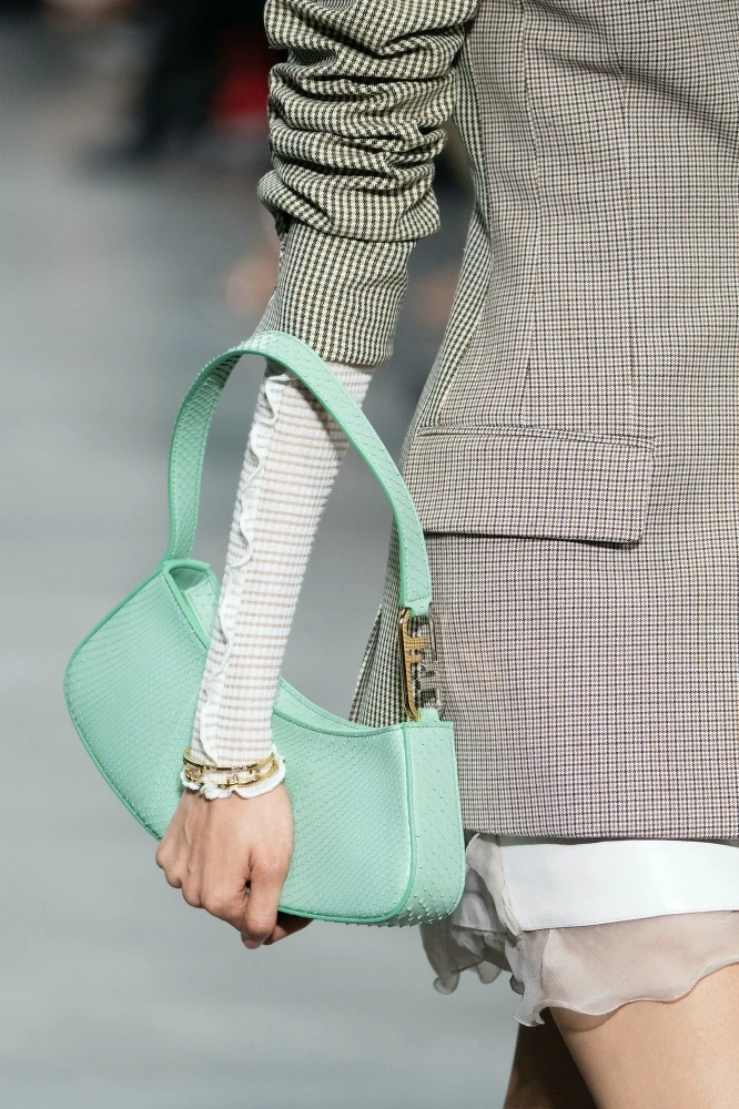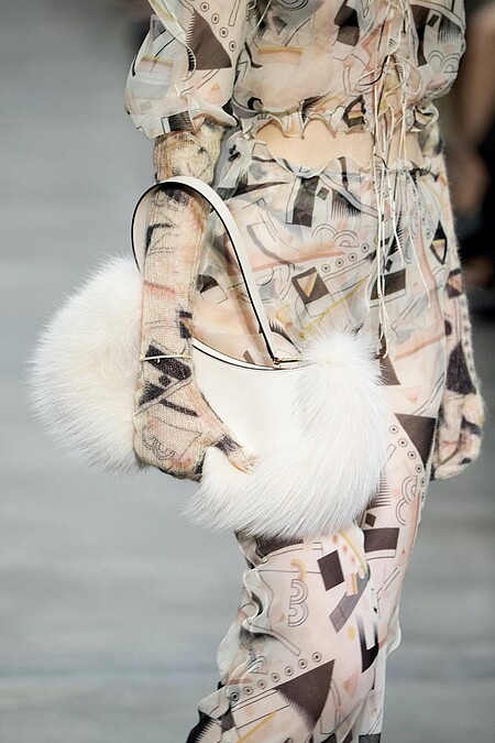 繼Fendi First、Fendigraphy之後,Kim Jones本季秀上再為大家帶來全新的包包設計——扁如薄餅、包包以圓弧的線條呈現,是時下頗受歡迎的腋下包包型。Kim Jones為其搭配了不一樣的質料,包含基本款的皮革面料,另有玳瑁+金屬O’Lock串起的背帶造型,以及冬日療癒的絨毛材質。