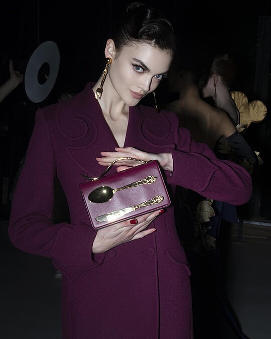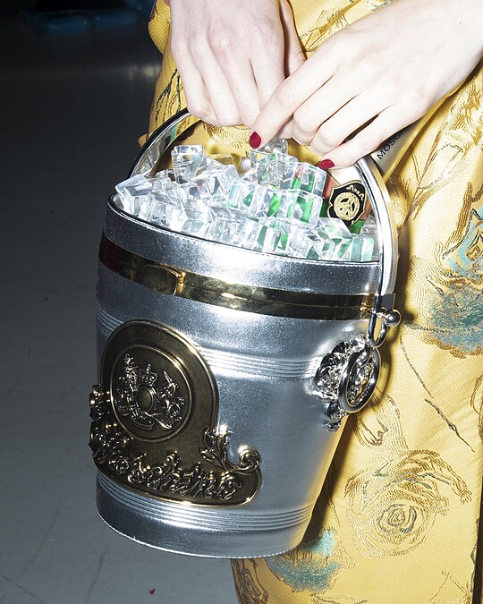 Moschino 2022秋冬時裝發表會,宛如一場盛大的中世紀宮廷舞會,晚宴上會出現的香檳冰桶以及刀叉餐具,皆變成本季的包包設計亮點。