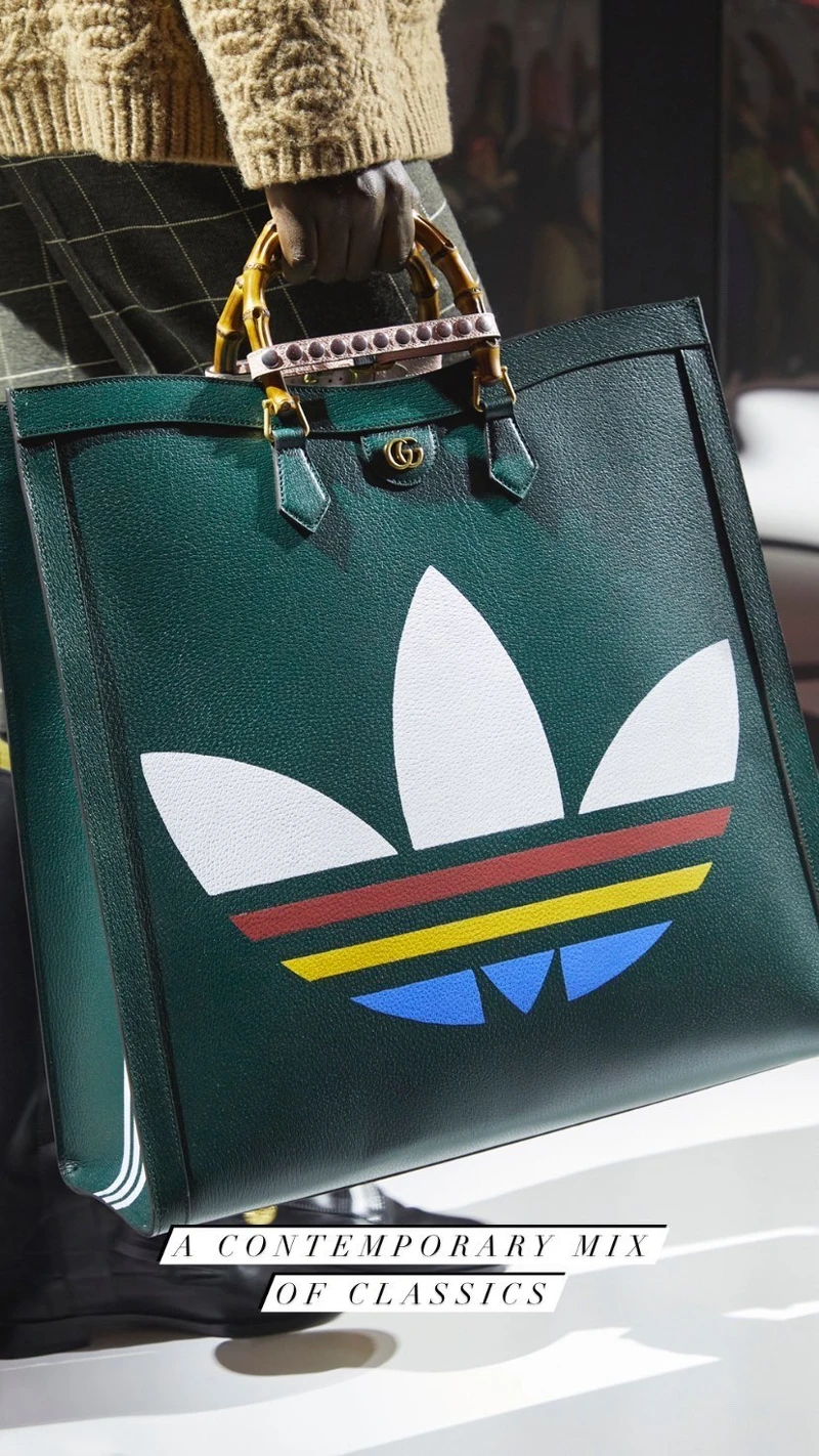 今年米蘭時裝週的一大看點,莫過於Gucci與adidas Originals的聯名系列!將經典的竹節包放置公事型的托特包大小,AM壓印上adidas三葉草logo,並於側邊添上愛迪達鍾愛的三線元素。