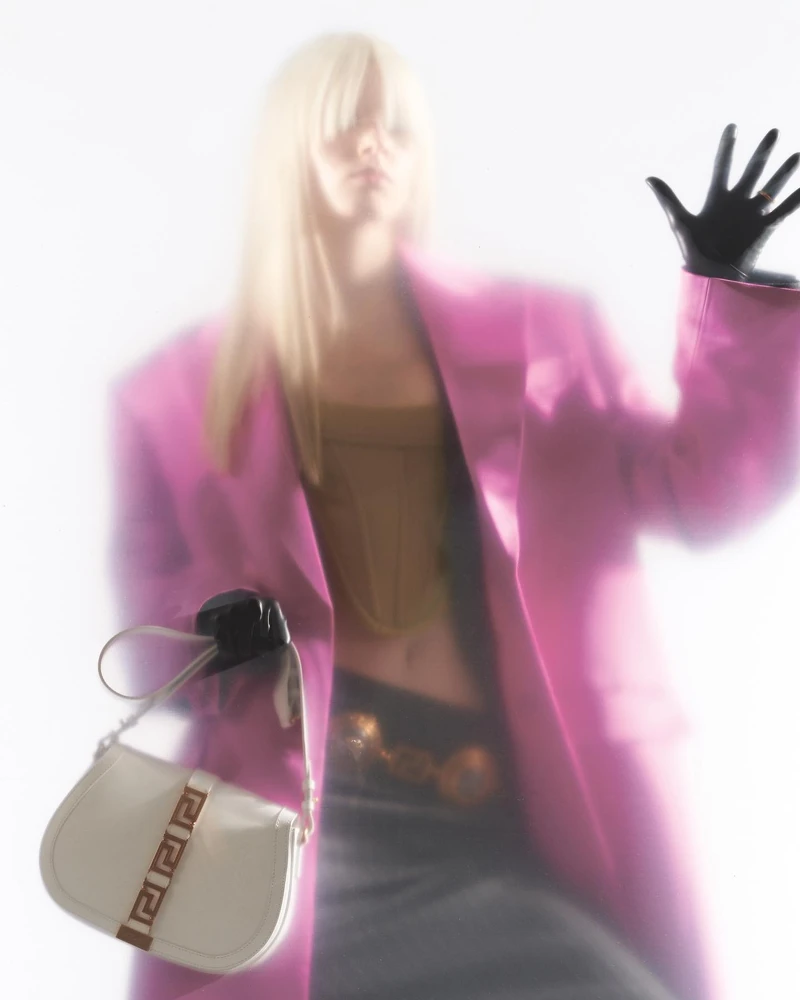配件類的全新主題《Greca Goddess》,Versace的迴紋符號化作金屬裝飾,並首波推出兩款新包包,一為馬鞍肩背包、另一為長形的馬鞍手拿包,是Versace較罕見的簡約造型。