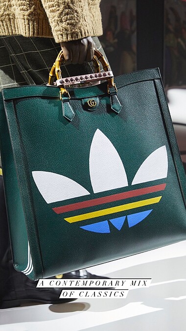 今年米蘭時裝週的一大看點,莫過於Gucci與adidas Originals的聯名系列!將經典的竹節包放置公事型的托特包大小,AM壓印上adidas三葉草logo,並於側邊添上愛迪達鍾愛的三線元素。