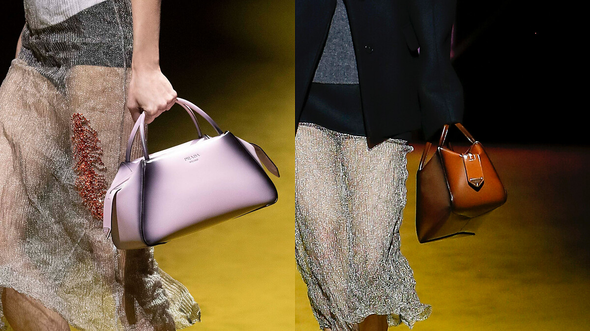 Prada經常以幾何線條作為包包的輪廓線條,2022秋冬時裝秀上出現了一款梯形狀的手提包,設計亮點在於拉鍊的部分。拉鍊長於包包本身,並在頂端兩處綴以Prada的三角logo。