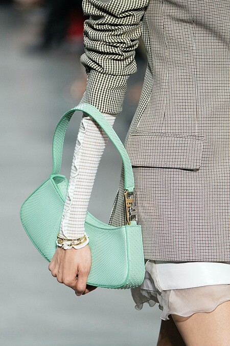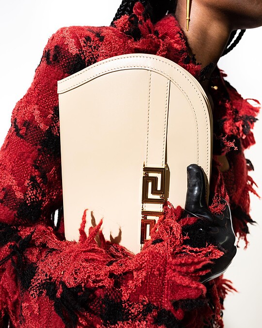 配件類的全新主題《Greca Goddess》,Versace的迴紋符號化作金屬裝飾,並首波推出兩款新包包,一為馬鞍肩背包、另一為長形的馬鞍手拿包,是Versace較罕見的簡約造型。