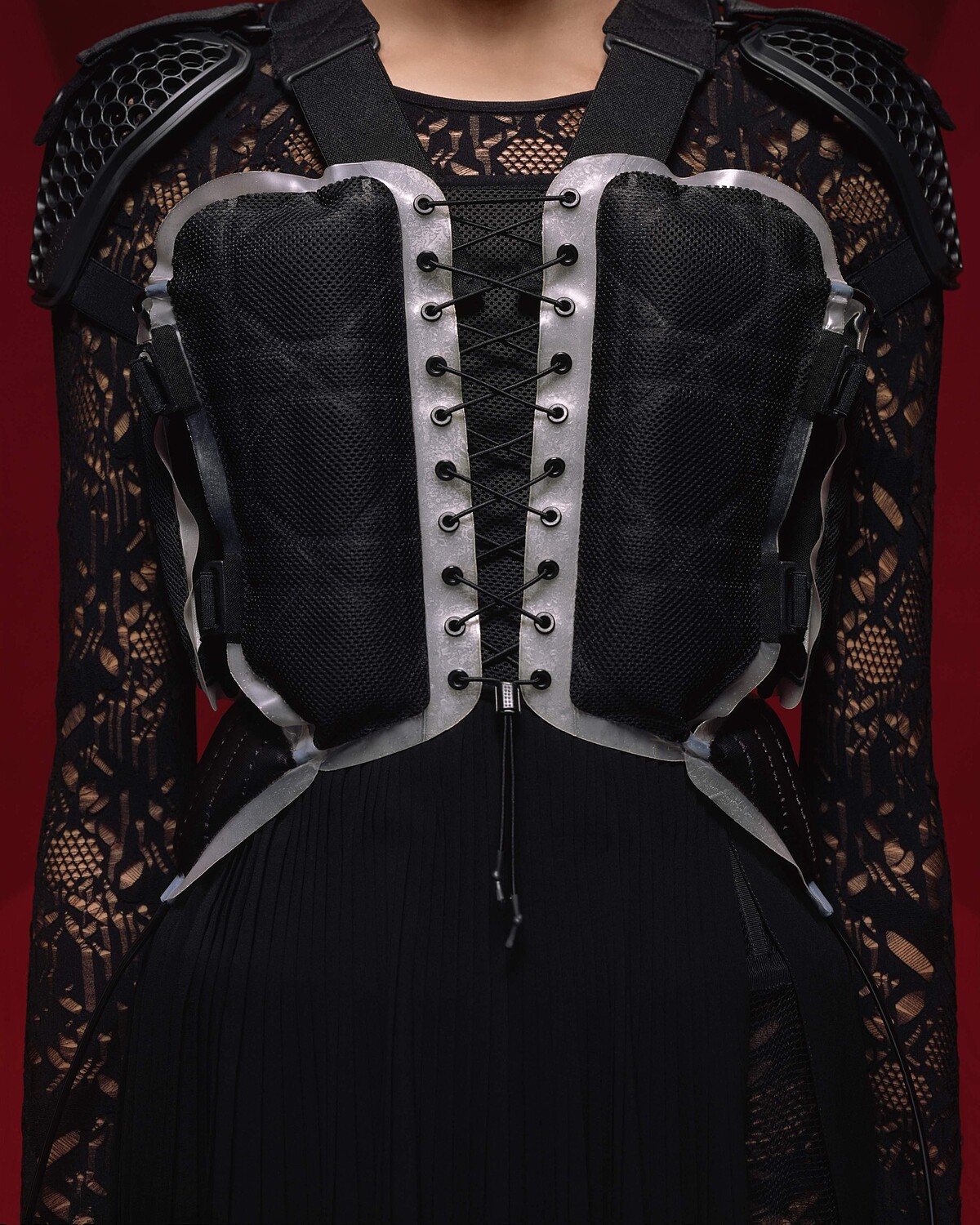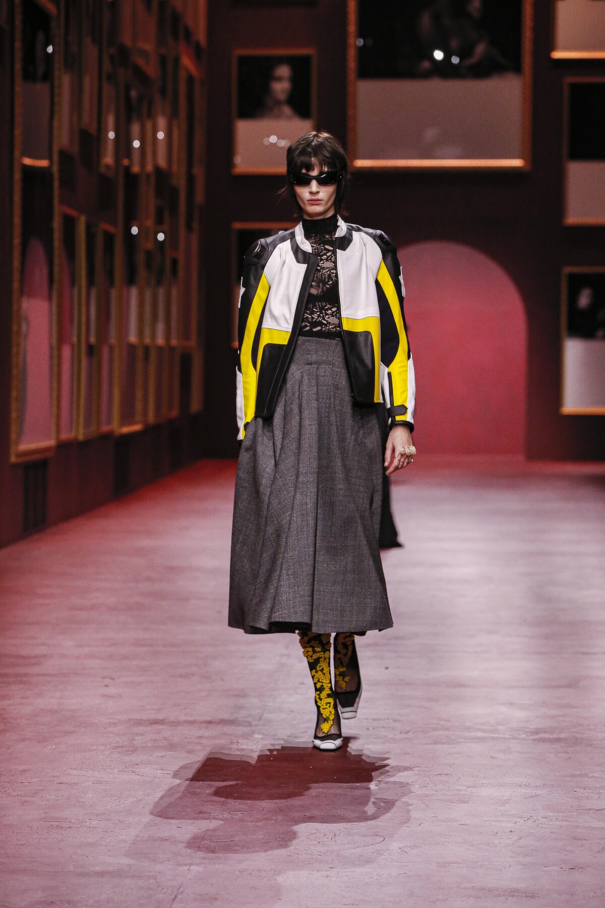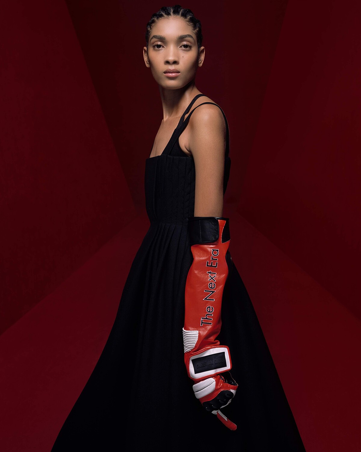 上述提及設計師 Maria Grazia Chiuri 圍繞在後人類(post-humanity)概念的實行,Dior 將時尚迷皆知的 Bar 外套加入功能性細節,經典的 Bar Jacket 有著複雜交錯的建築結構,藝術家同時認為此件作品代表了 Dior 的經典標誌,也是每個系列中的底蘊。本次便將高科技灰色網眼材質重新詮釋,結合 Antarctica Suit 南極套裝設計,比如在背部植入複雜的熱能系統,讓人們在極端氣候也能適應活動,也可看到在重機騎士風手套中鑲嵌高科技材質,有趣的是,這些單品在五○輪廓下卻又融入高科技機能性,看似衝突,實則是向 Christian Dior 先生的 New Look 致敬,彷彿走入《Drive》中 Cyberpunk 般的霓虹光影之中。
