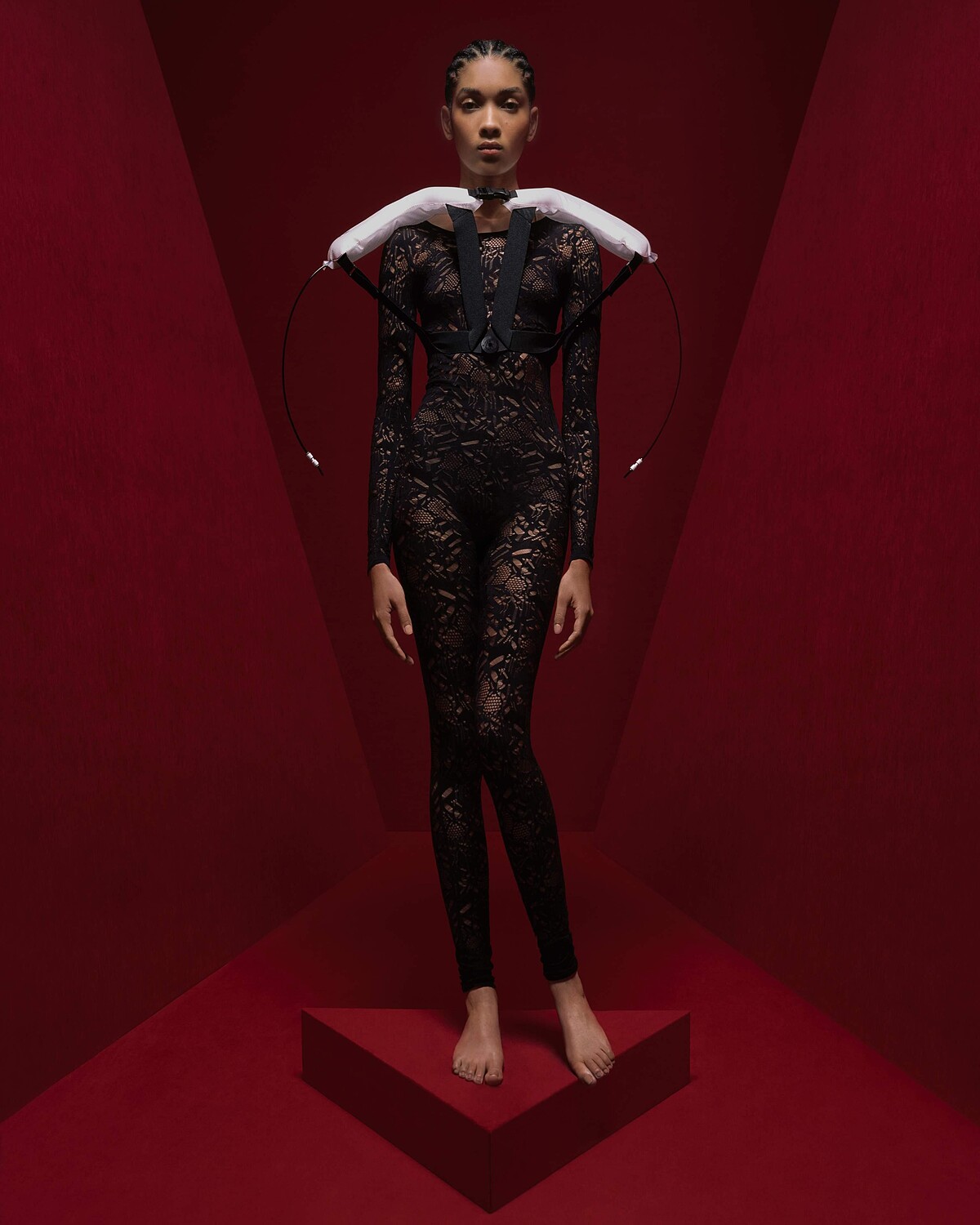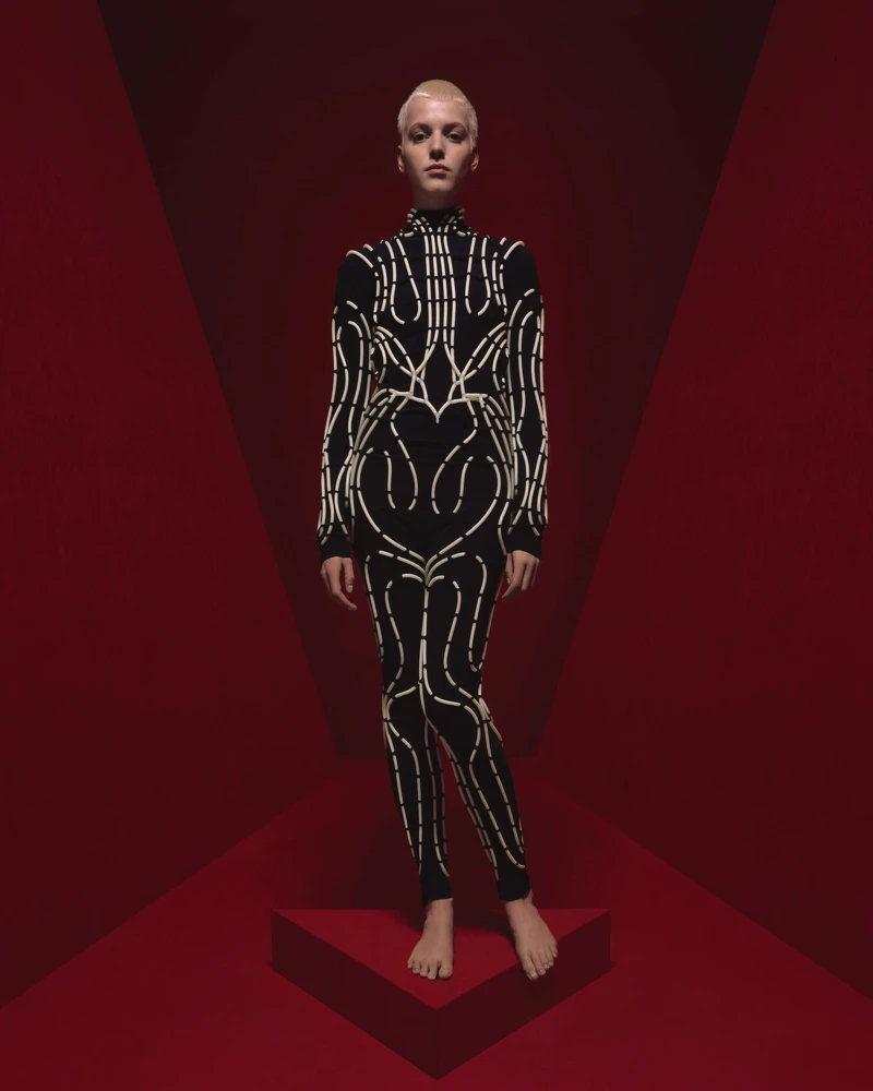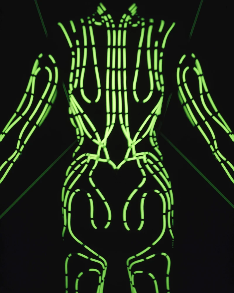 上述提及設計師 Maria Grazia Chiuri 圍繞在後人類(post-humanity)概念的實行,Dior 將時尚迷皆知的 Bar 外套加入功能性細節,經典的 Bar Jacket 有著複雜交錯的建築結構,藝術家同時認為此件作品代表了 Dior 的經典標誌,也是每個系列中的底蘊。本次便將高科技灰色網眼材質重新詮釋,結合 Antarctica Suit 南極套裝設計,比如在背部植入複雜的熱能系統,讓人們在極端氣候也能適應活動,也可看到在重機騎士風手套中鑲嵌高科技材質,有趣的是,這些單品在五○輪廓下卻又融入高科技機能性,看似衝突,實則是向 Christian Dior 先生的 New Look 致敬,彷彿走入《Drive》中 Cyberpunk 般的霓虹光影之中。