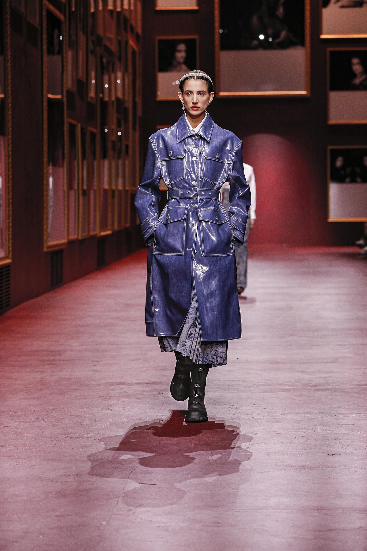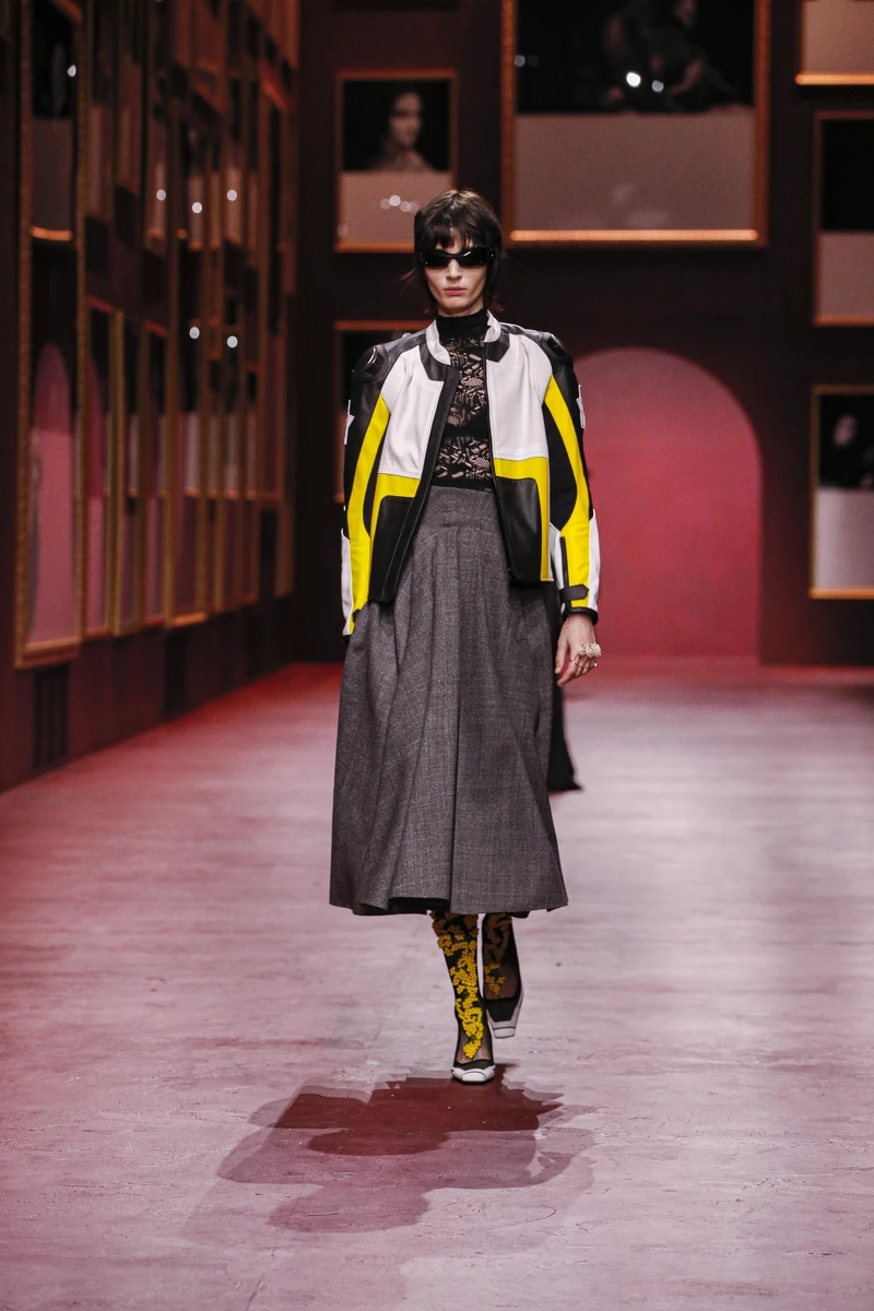 回歸經典核心,Maria Grazia Chiuri 將經典的 Lady Dior 融入日常造型,融入中性風格,裙裝以男裝的 grisaille 灰色布料製作,同時品牌一貫的精緻工藝如刺繡與科技針織布料、防水布、尼龍和喀什米爾羊毛搭配,打造出具有叛逆型格的未來女性特質。