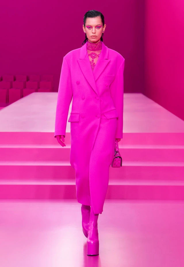 Valentino 2022秋冬系列,創意總監Pierpaolo Piccioli藉粉紅色的多種面向,深入探討單一色調的世界。