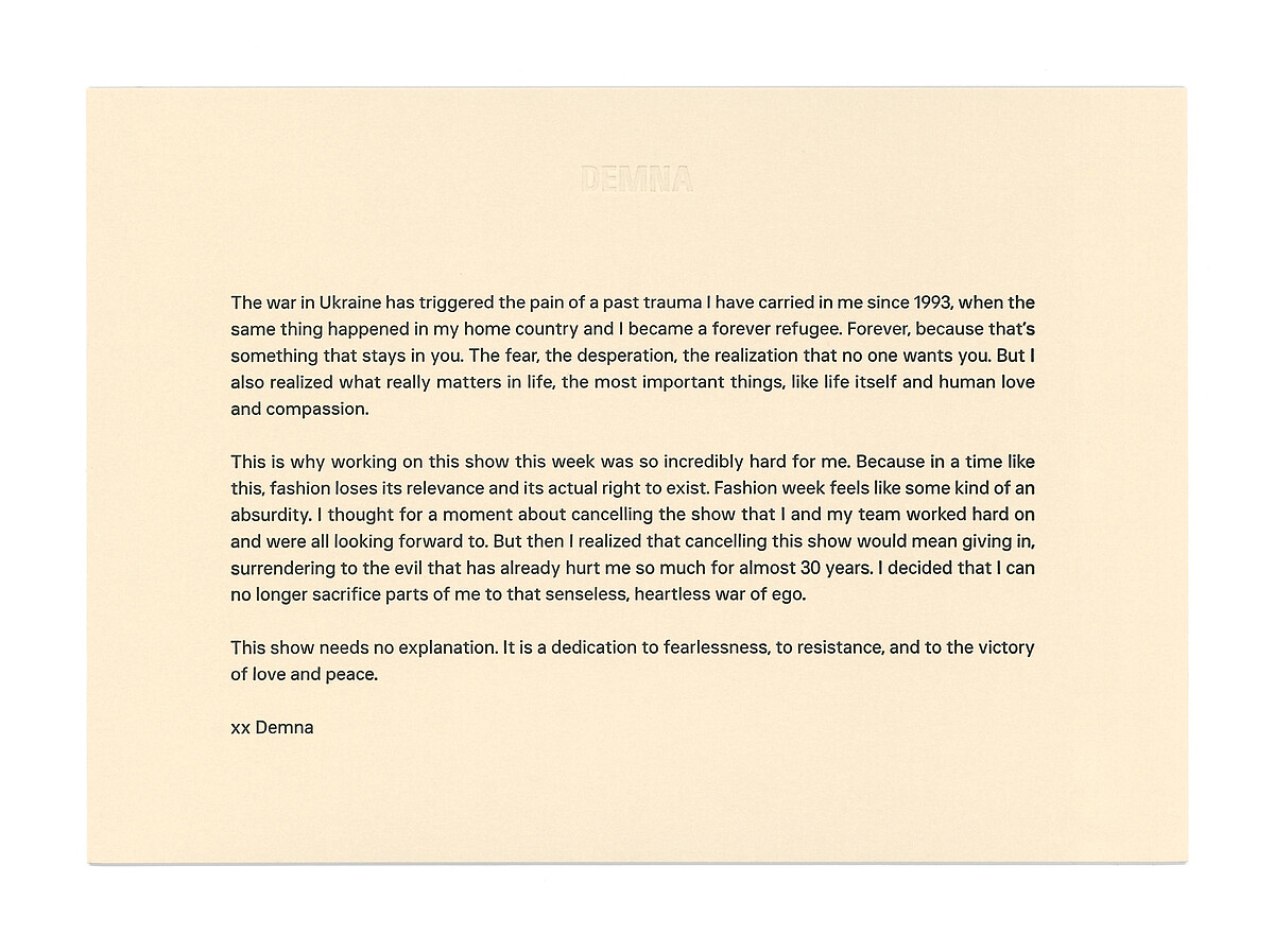 Balenciaga 2022冬季大秀正式登場前,Demna Gvasalia也想過要取消,不過為了不讓設計團隊的心血付之一炬,Balenciaga 2022冬季系列以更為強烈存在感登場,像是特地準備的看秀禮物,是用烏克蘭國旗顏色製作的T-Shirt、Demna Gvasalia精心準備的秀前口白,傳遞反戰精神來鼓勵烏克蘭人、倒數一二登場的禮服,同樣以烏克蘭國旗配色為設計。