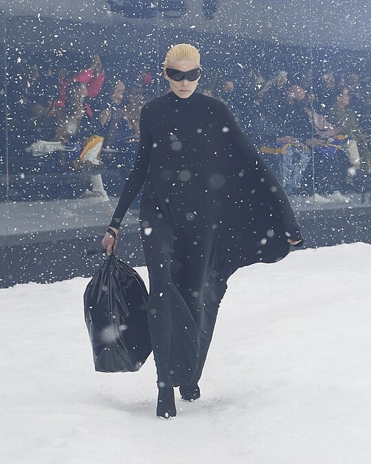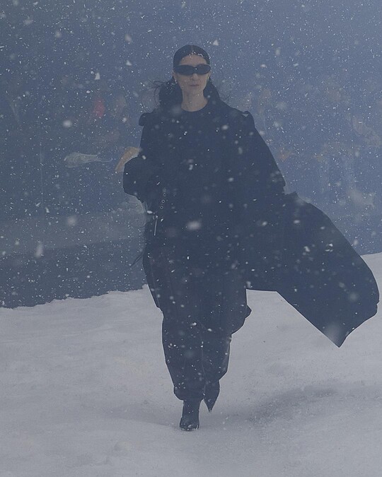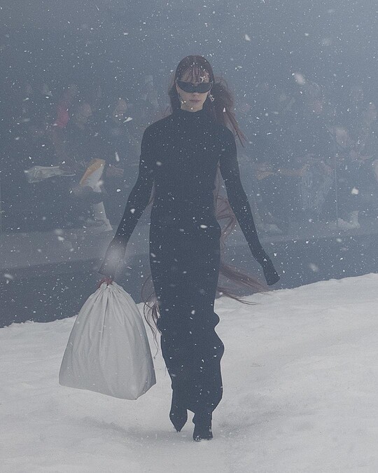 大秀的安排圍繞著國際時事,不過Balenciaga 2022冬季系列真正的主題其實是--未來,Demna Gvasalia認為在不久的將來,所有再平凡不過的事物,都會變得稀少珍貴,就像特別打造的360°全景的秀場,飛舞著漫天白雪,這個場景是不是與小時候收藏的水晶球極為相似。