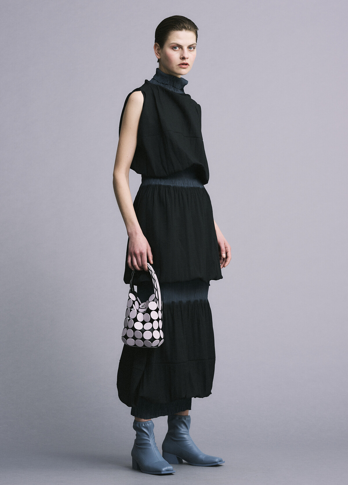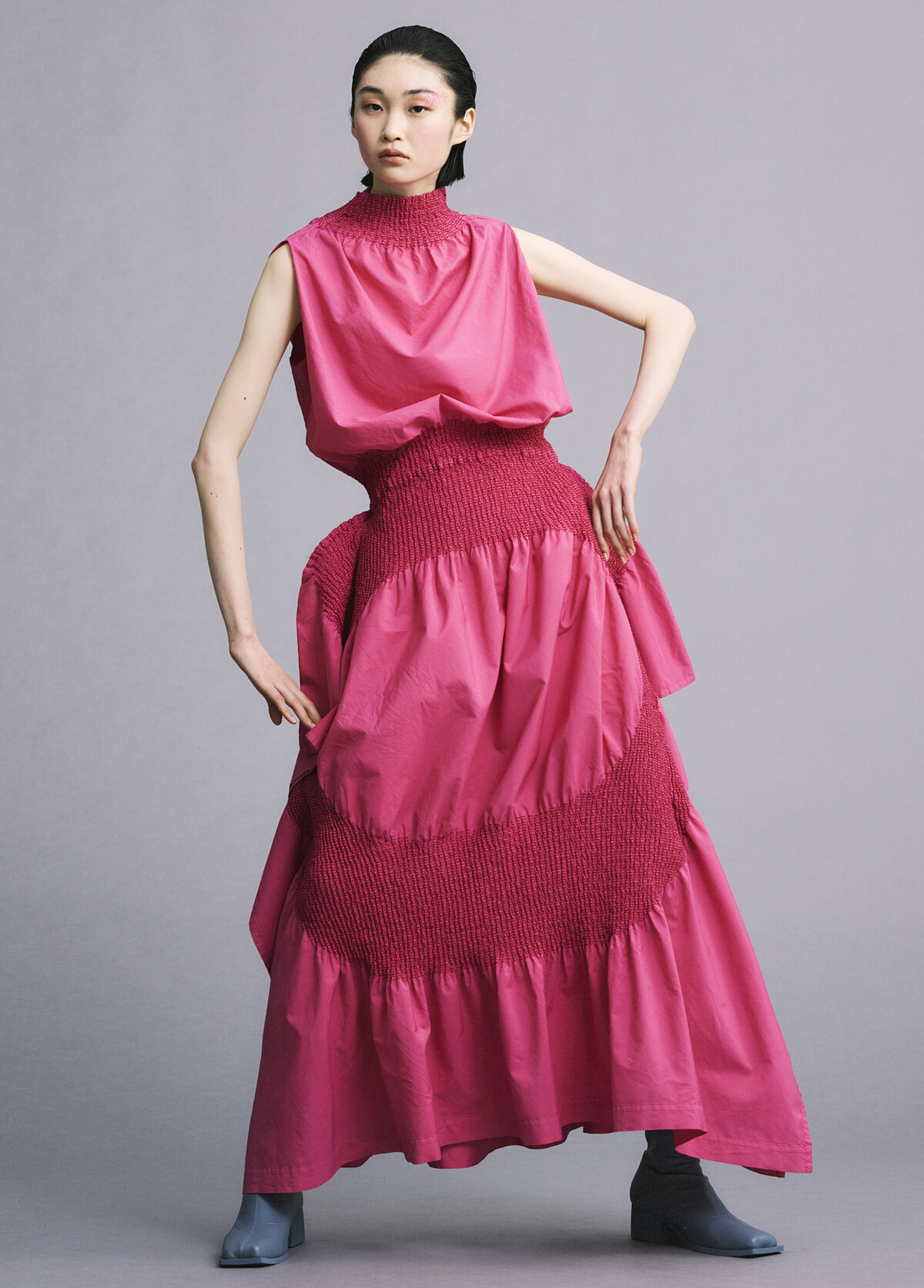 PODS:外觀有如碗豆莢的PODS,以傳統紮染技法打造的縐褶系列,將三件圓形布料相連製成。