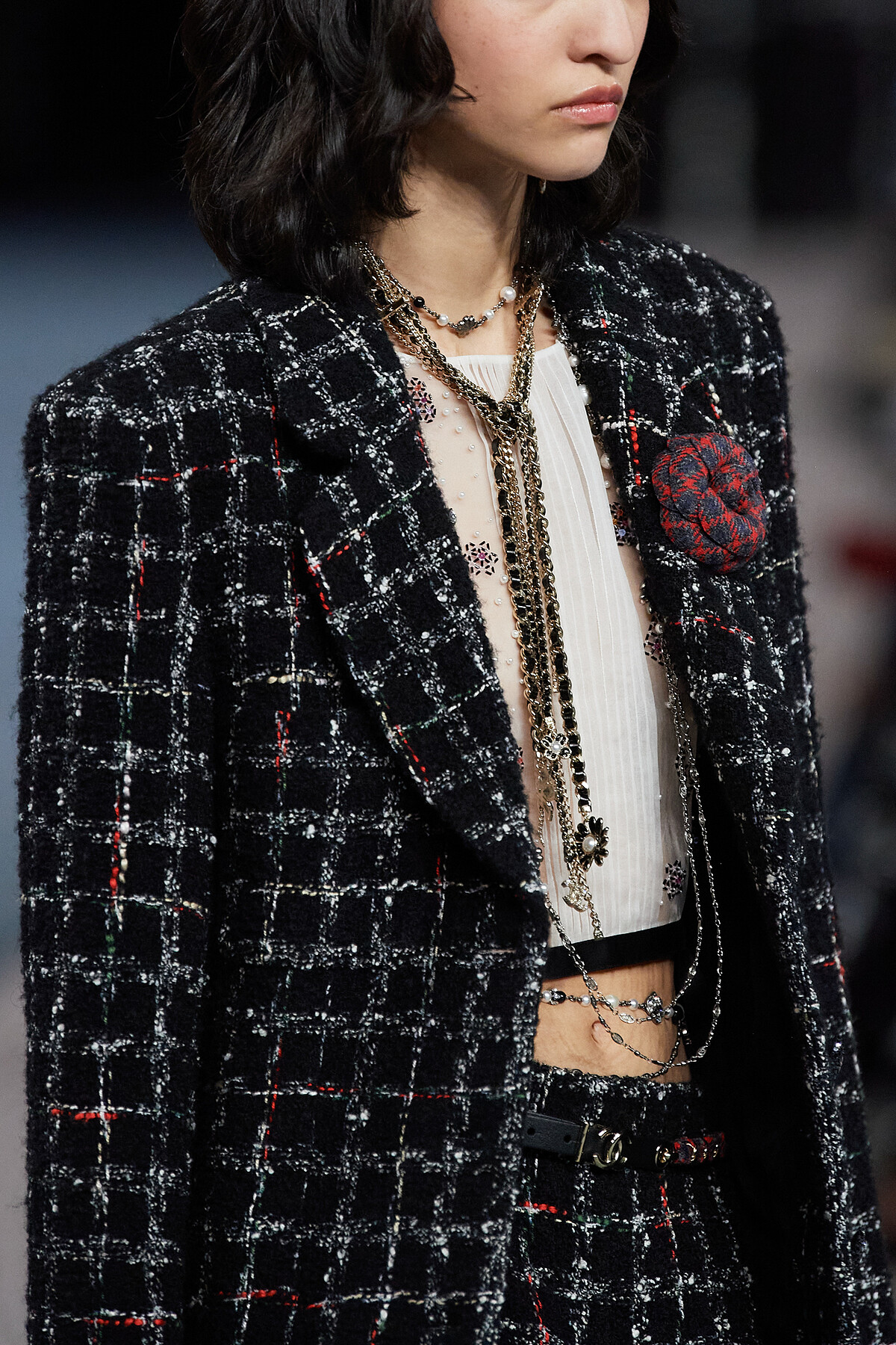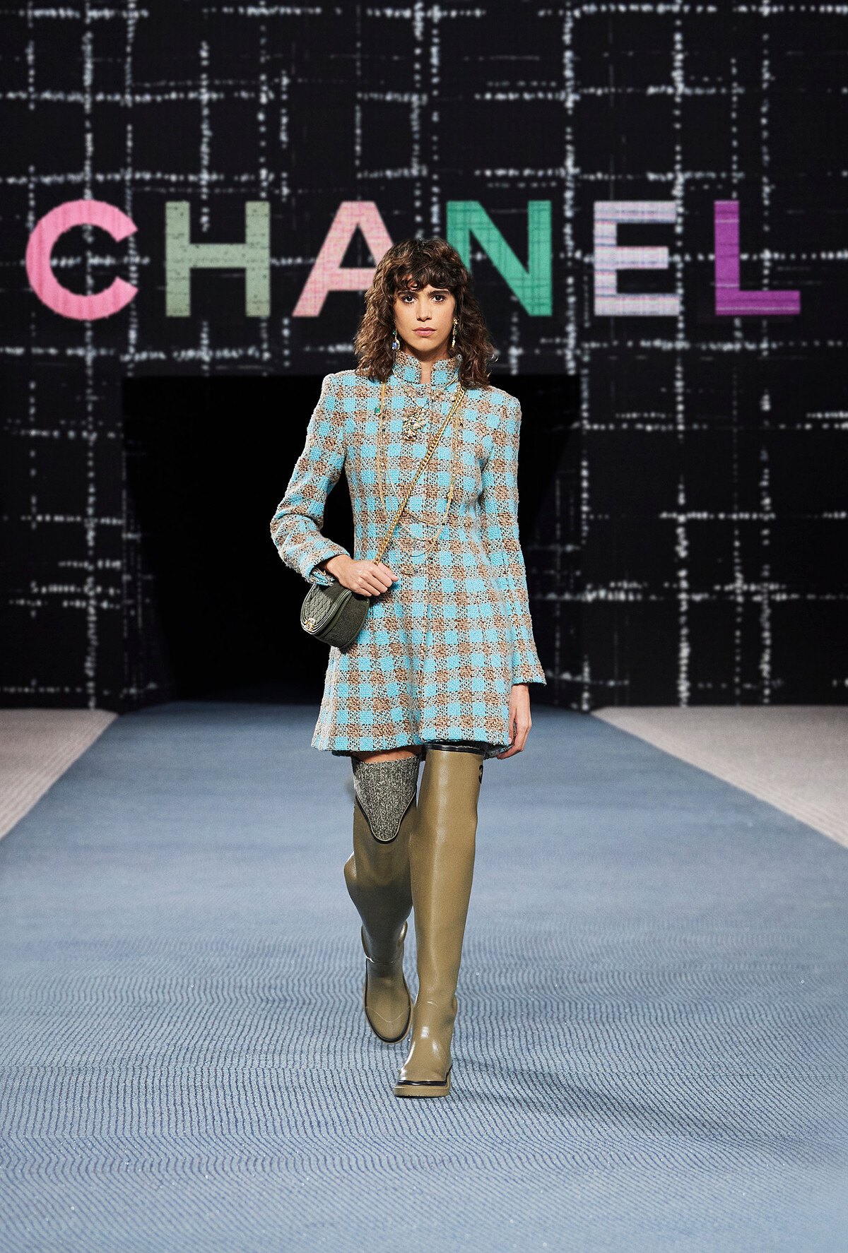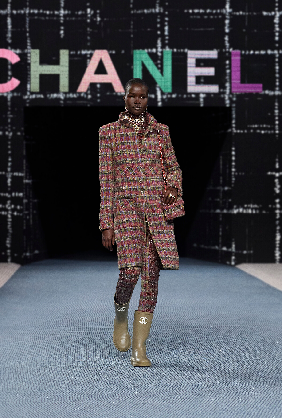 呼應Tweed的誕生背景,Chanel 2022秋冬系列呈現了不同時期的英倫穿搭風格:有典雅的裙裝示範、與皮革套裝搭配的俐落個性、率性的搖滾精神⋯⋯呈現出斜紋軟呢的多種風情。