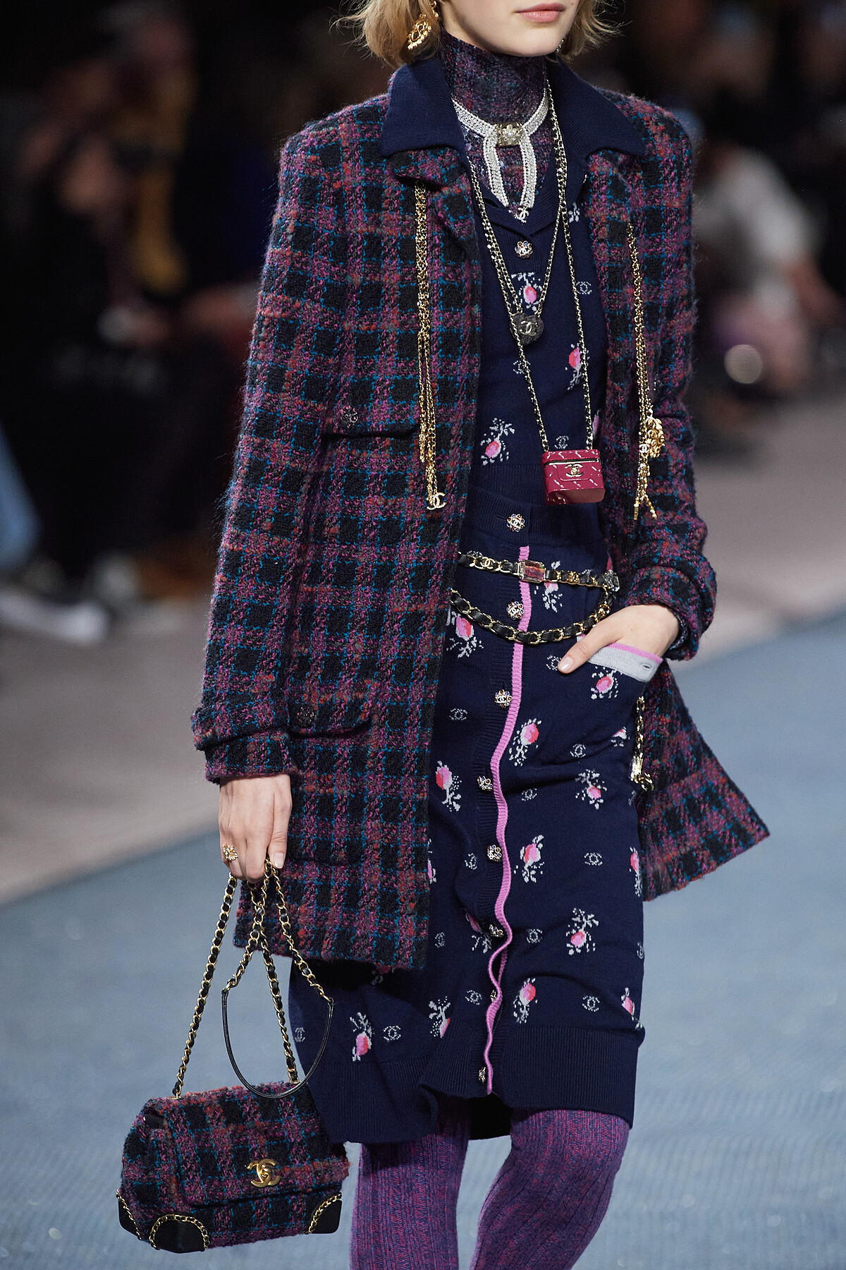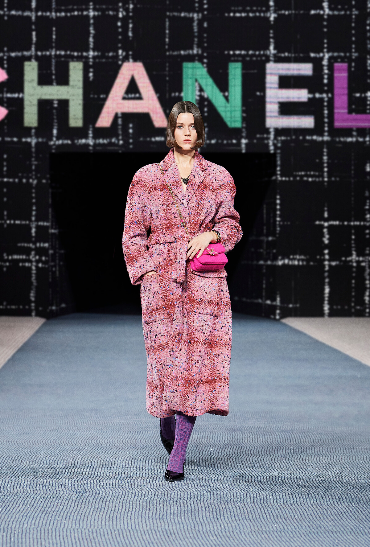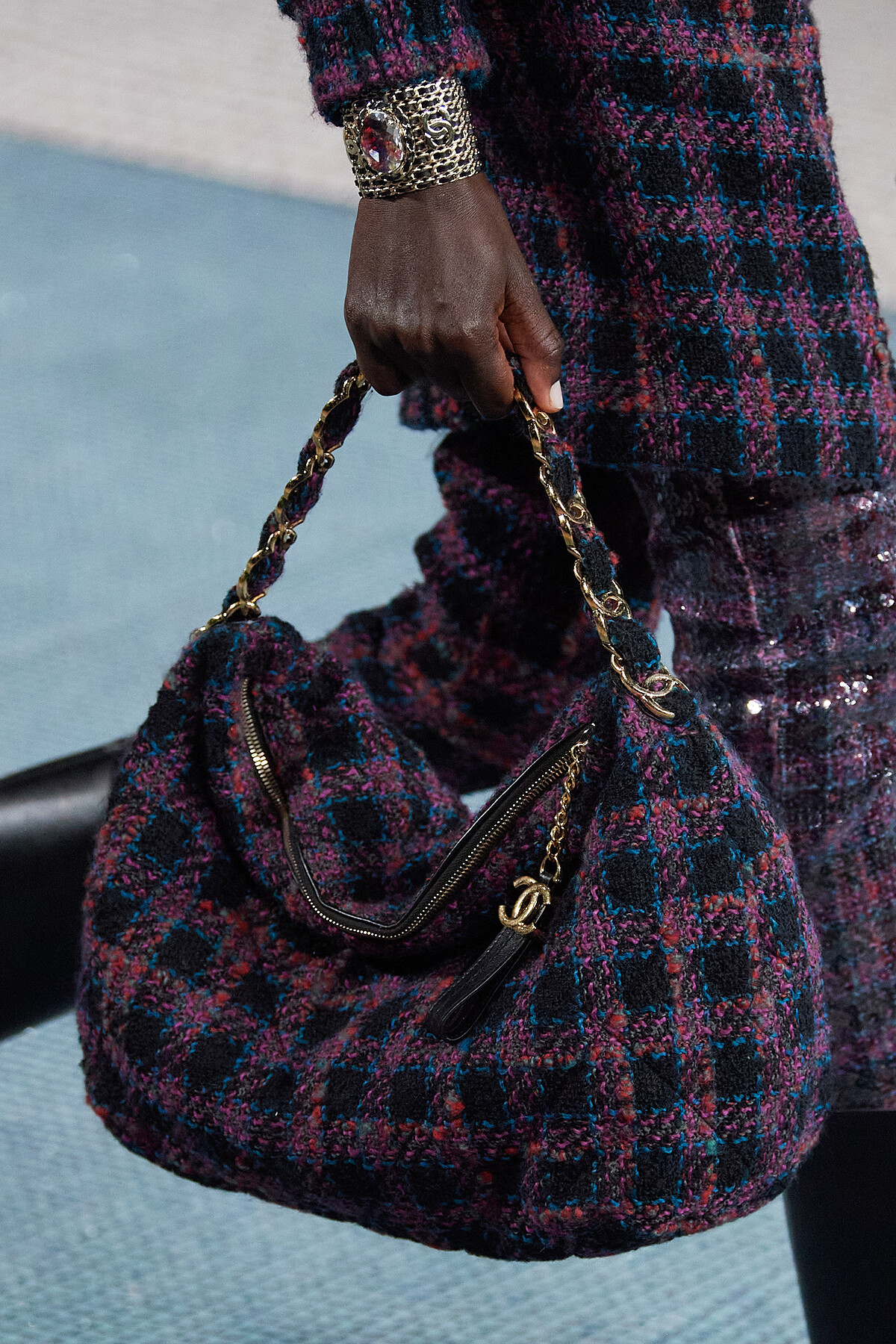 緊扣斜紋軟呢的主題下,Chanel 2022秋冬發表會上的包包大部分多以tweed的材質呈現,包含大家熟悉的2.55、經典口蓋包、小型化妝包等,其中還出現了全新的流浪包輪廓。