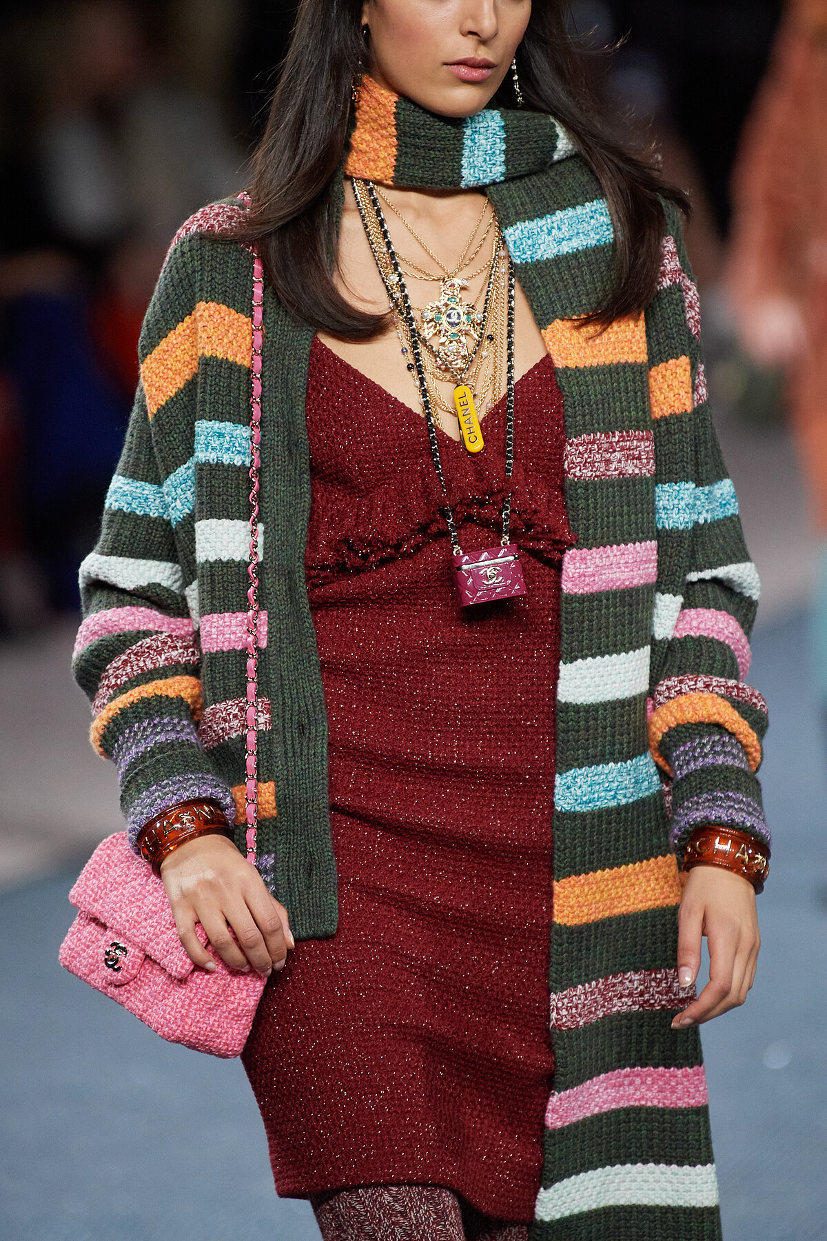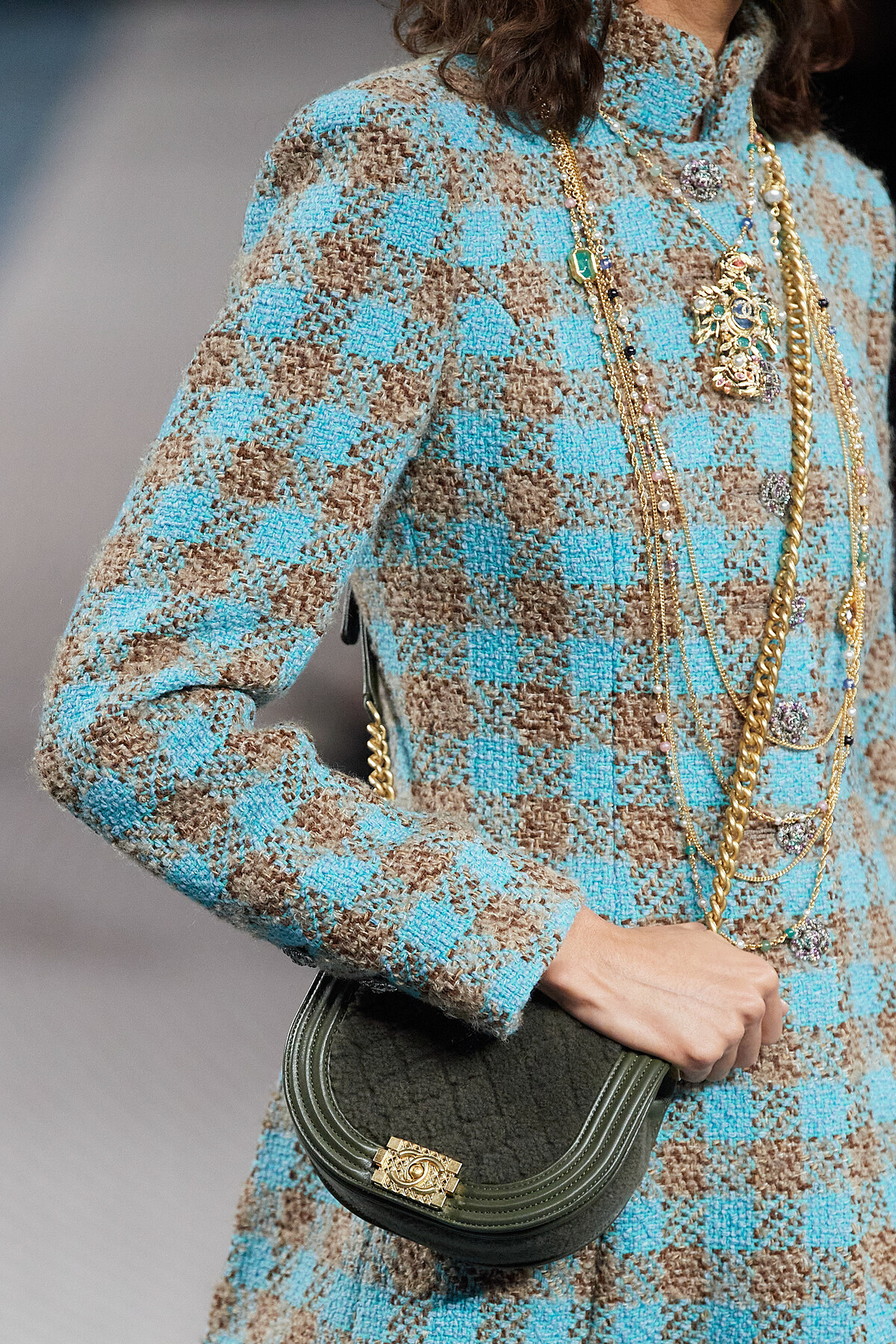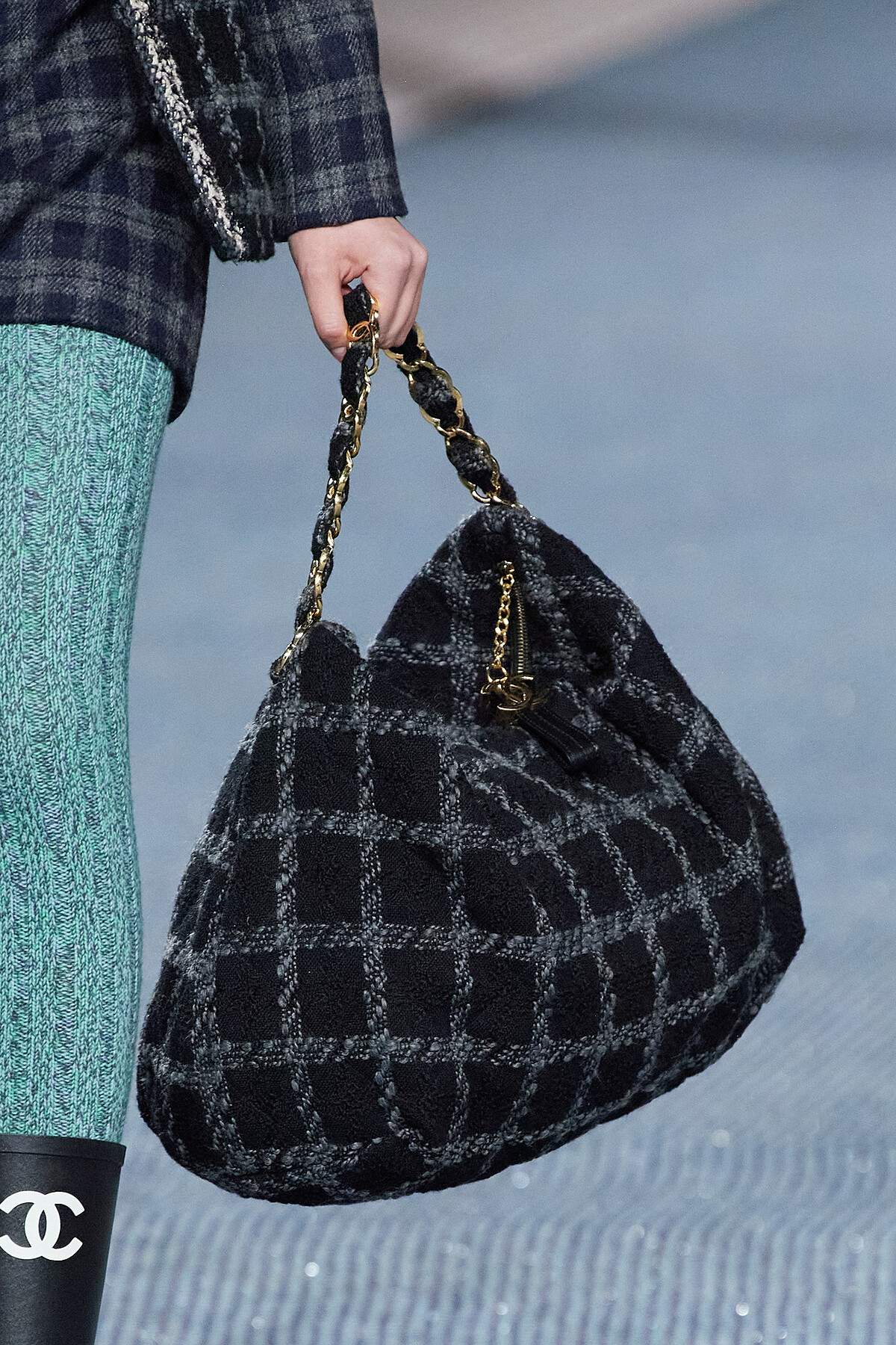 只有Chanel可以超越Chanel,大手筆地將整個秀場空間鋪上斜紋軟呢的面料。你知道嗎?斜紋軟呢的原文Tweed,命名是源自於英格蘭與蘇格蘭的交界之河River Tweed,Chanel遂將伸展台打造成蜿蜒河渠的模樣以呼應這樣的背景故事細節。