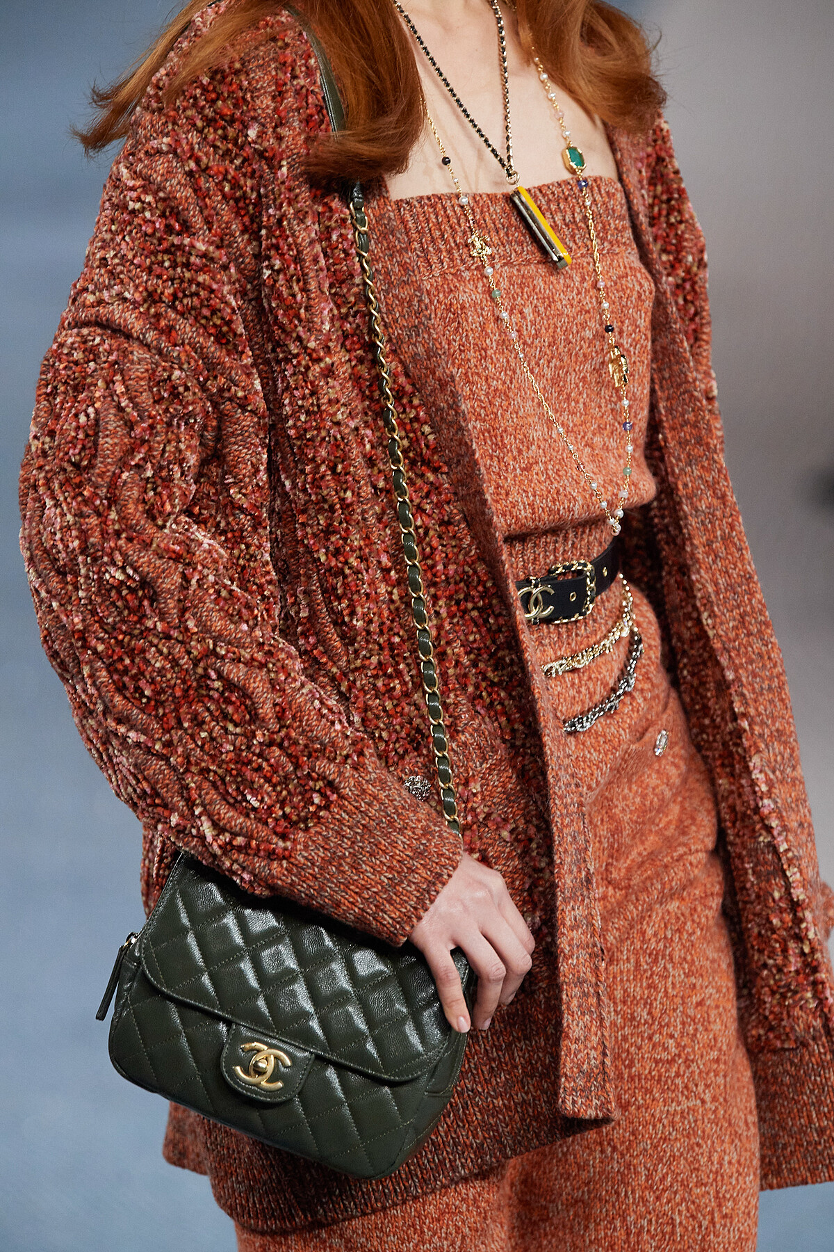 而剛剛落幕的蘋果新春發表會,官方釋出了最新的「松嶺青色」剛好也出現在Chanel 2022秋冬秀上!帶著大自然療癒感的青苔綠,別具沉穩氣質,目前釋出一款皮革的口蓋包,與一款絨毛材質的馬鞍包。