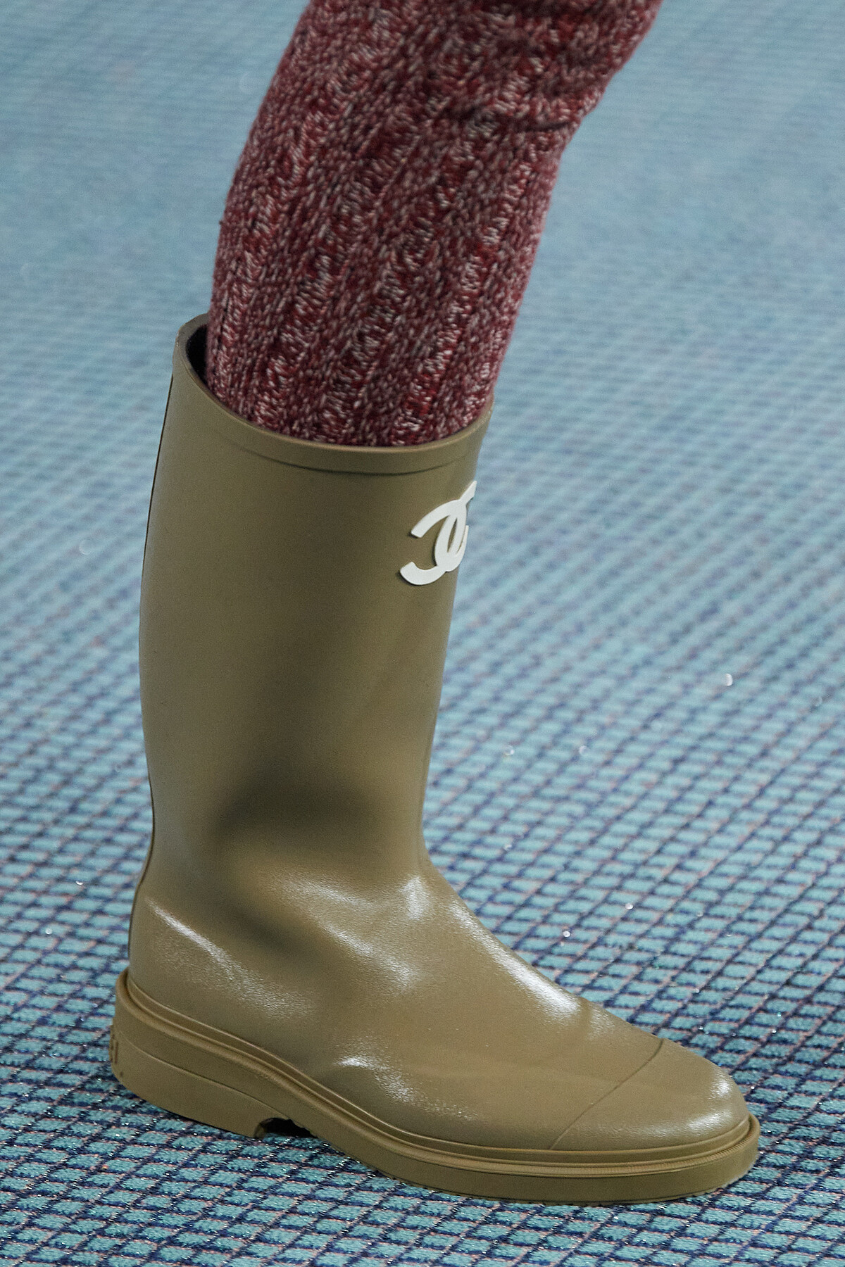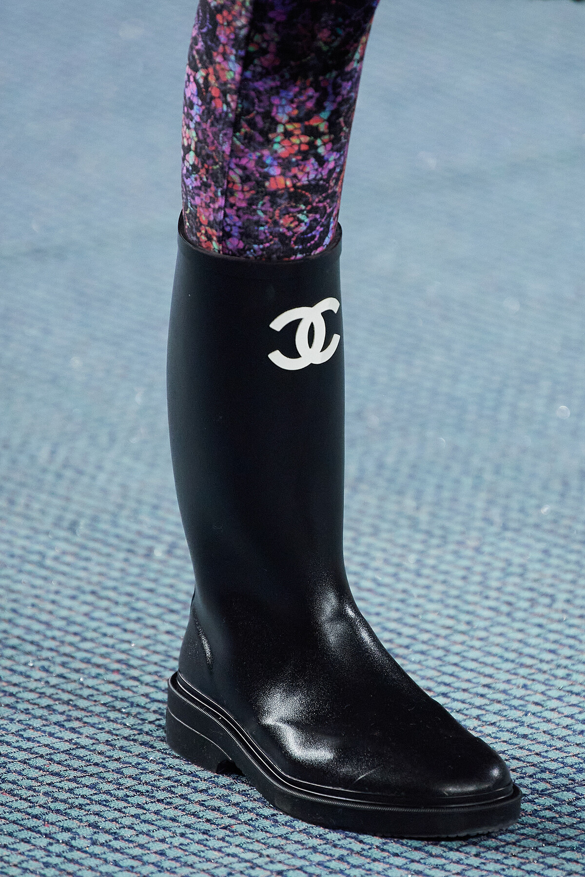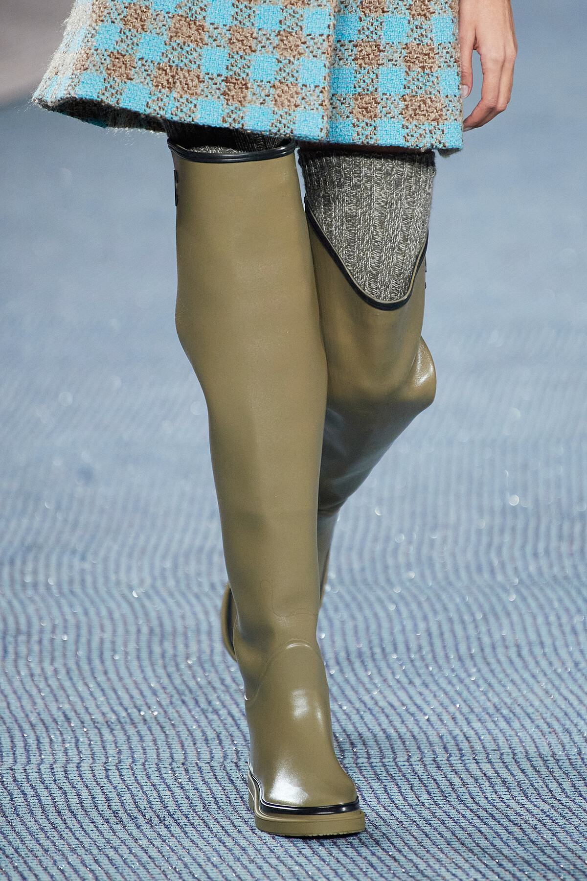 再次回到Tweed的誕生之地——英倫,當地天氣經常呈現陰雨綿綿的狀態,讓Virginie Viard因而發想出過膝與短筒兩種筒高的雨靴。