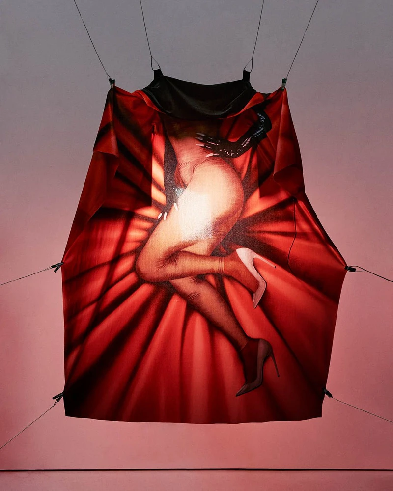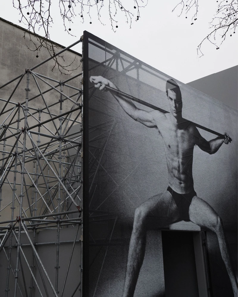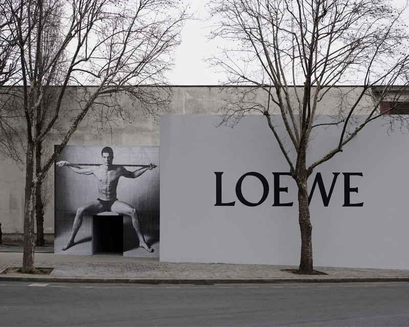 此次 Loewe 秀場的呈現彷彿讓人走入超現實夢境般,比如秀場中的巨型南瓜就是藝術家 Anthea Hamilton 特為此系列打造的新作品《Giant Pumpkins》,而大型棚架裝置是複製了其經典的《Aquarius》(2010年)。上述有說道 Anthea Hamilton 擅長以圖像表述自身觀點,在秀場布幕上的壯碩男人身著小泳褲,藉此表達理想化的男人身軀,從崇拜到質疑,藉由圖像觸動內心最深層的慾望。