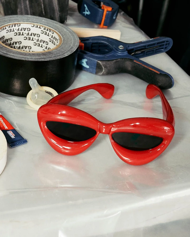 超現實主題環繞整體設計概念與單品,宛如氣球輪廓的裙裝,氣囊般的質感,輕盈且柔軟,垂墜感讓服裝更具生命力,英式幽默氛圍為造型更添玩味,無可取代的鞋履樣式也讓人產生對設計更多的創作可能性。