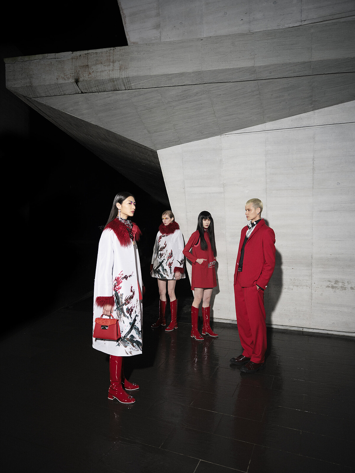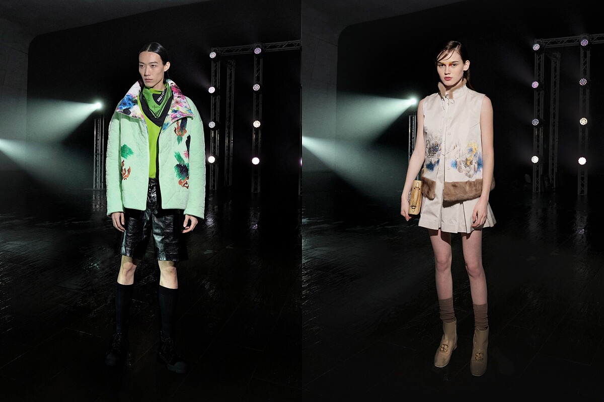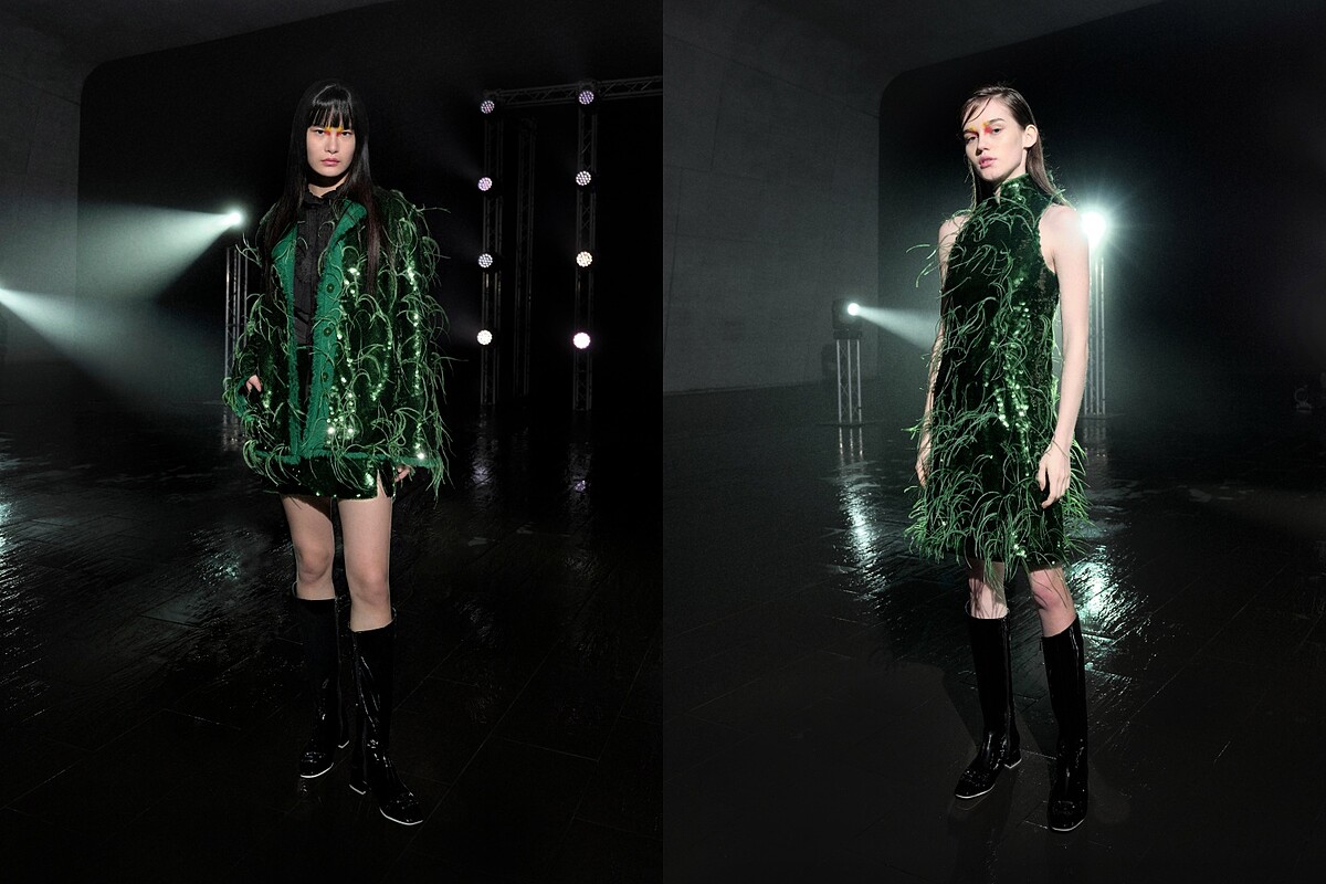 而因為有了光,才出現了影,開場走出的第一套造型以運動風的高領毛衣搭上一件浮華羽毛寬褲,兩個對比元素呼應光影之間的關係。