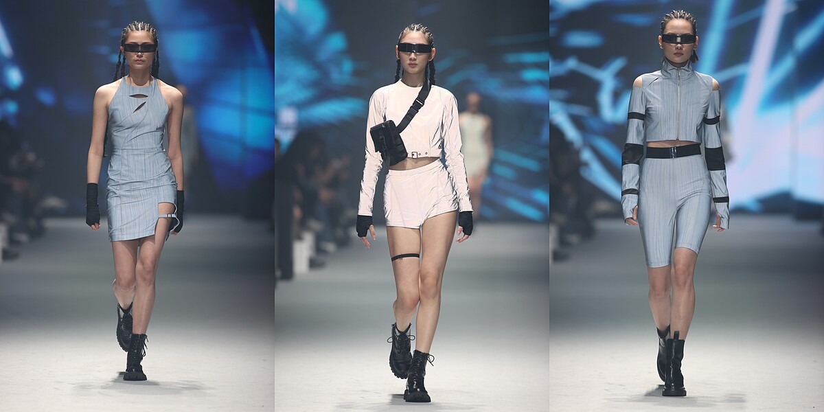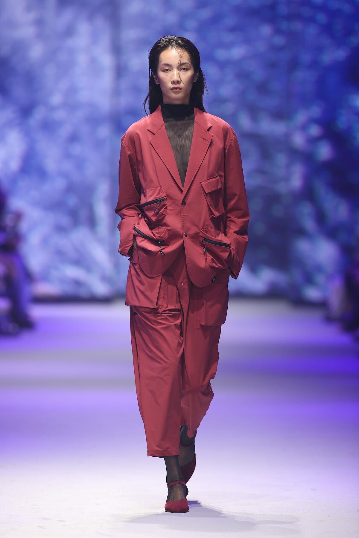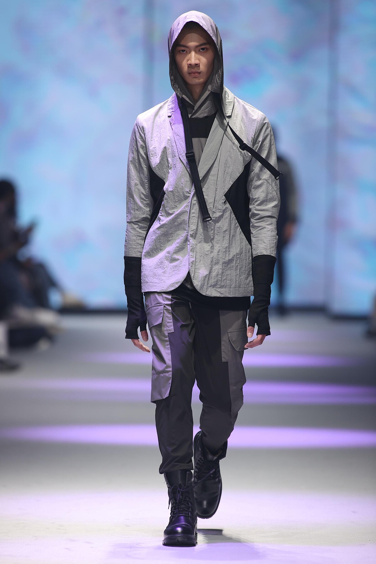 想要呈現出太空感的方式有很多,而在今年的秋冬台北時裝週上大抵可簡化為2種元素:一是金屬色系的面料選用,二是幾何線條的剪裁方法。前者可見於Dycteam的one tone套裝、UUIN的浮華禮服、oqLiq 的機能背心等服飾。