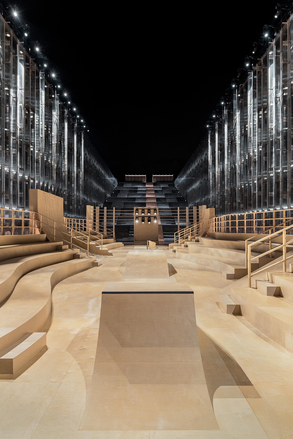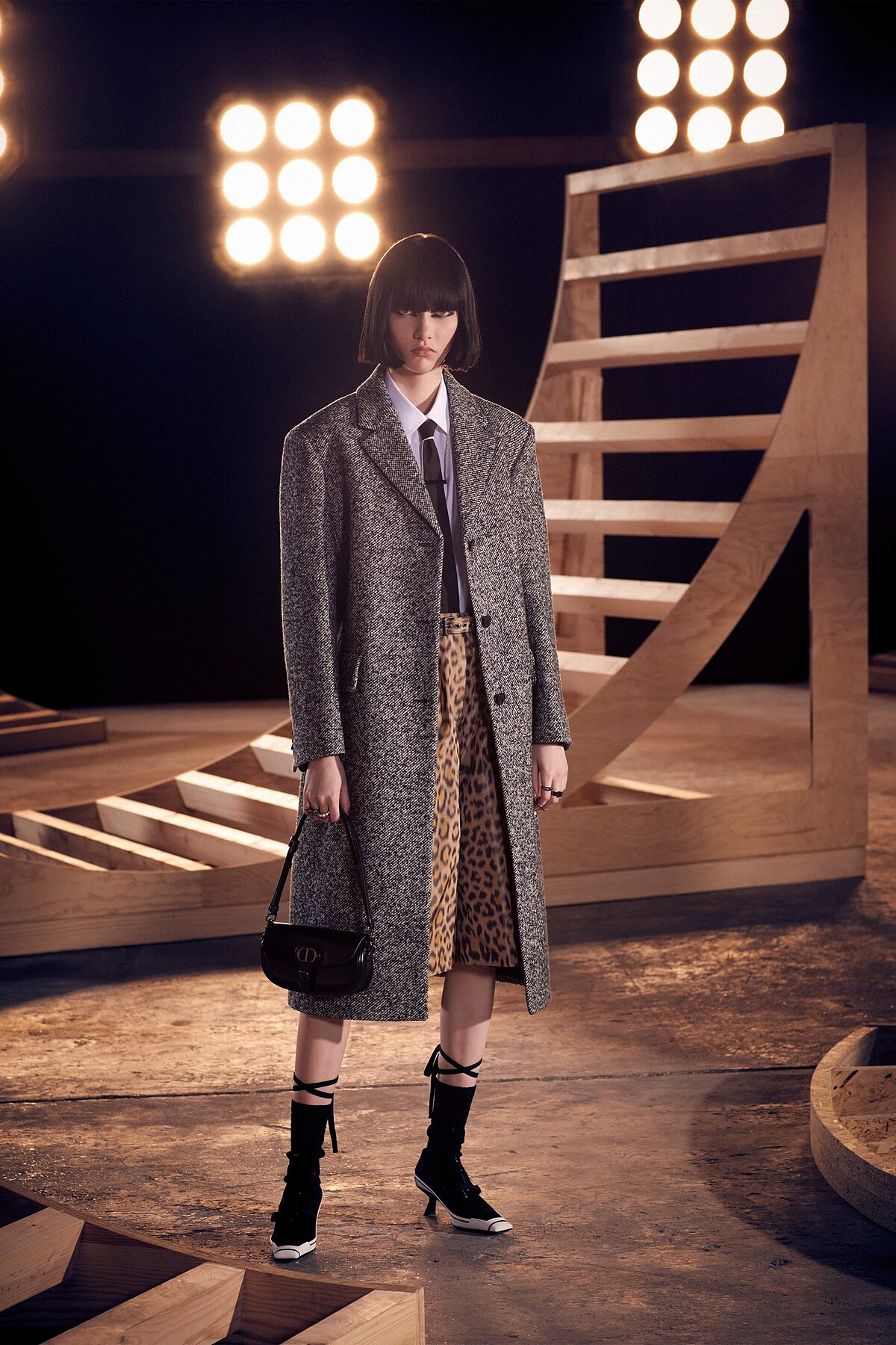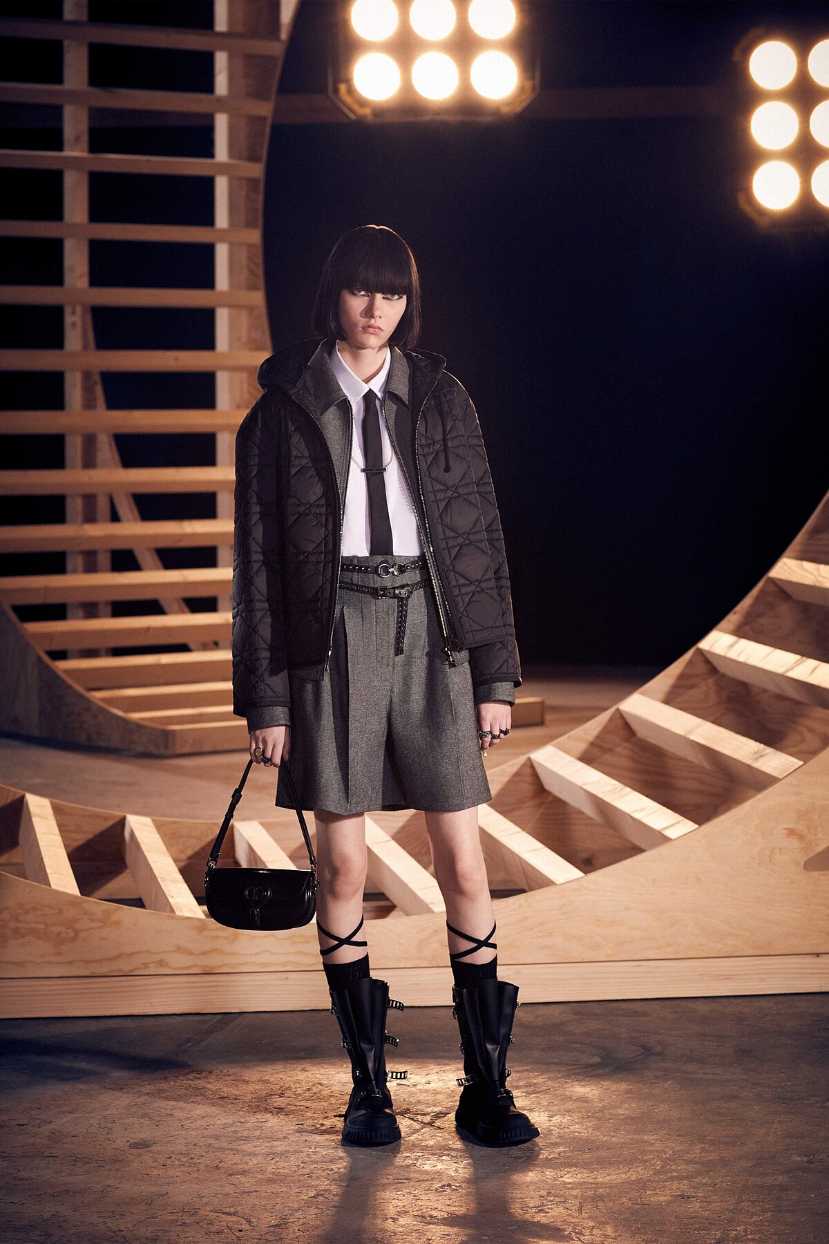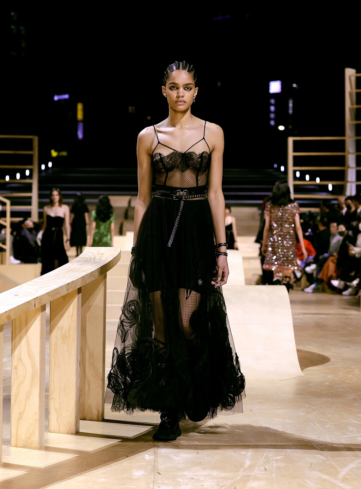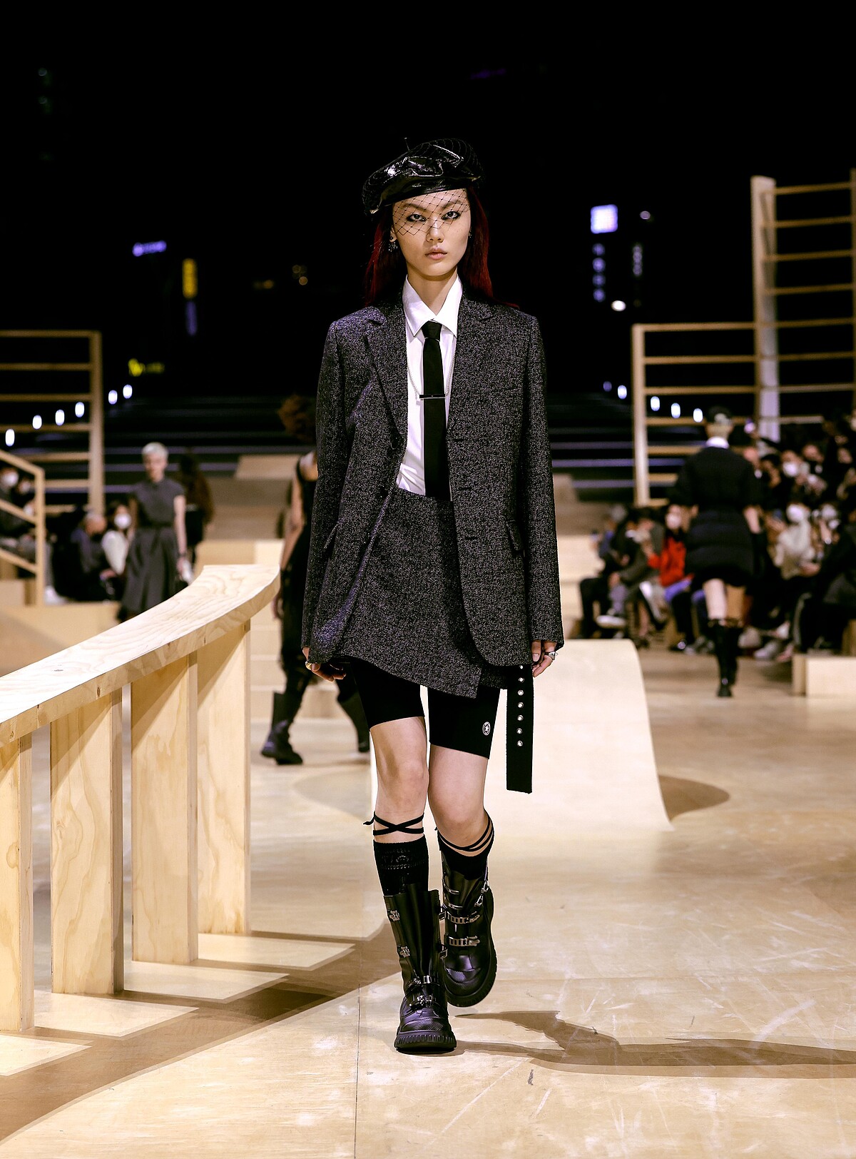 自Dior Vibe登場以來,運動元素成為Dior這幾季時常出現的設計重點。Dior將大秀場景加入了些許滑板的斜坡裝置,並邀請了10位滑板高手,從舞台的最高處向下俯衝、滑過觀秀群為大秀暖場。
