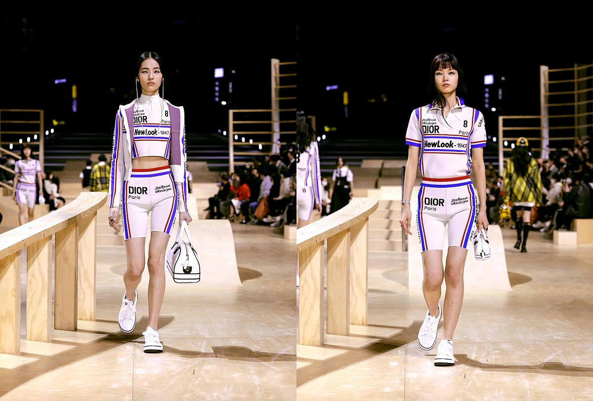 紅白藍色彩組合交織出的運動套裝,上面寫著蒙田大道30號、1947 New Look、數字8⋯⋯所有代表著Dior的符號,也預告著後續將出現致敬迪奧先生的經典設計。
