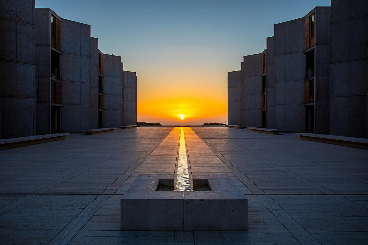 1965年完工的Salk Institute索爾克研究所,集聚所有科學界的權威在此進行研究,最大的建築特色,就是能一覽太平洋風光的壯麗景緻,在兩側以粗獷主義設計的建築襯托下,其美景更顯獨特。