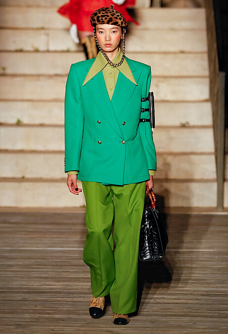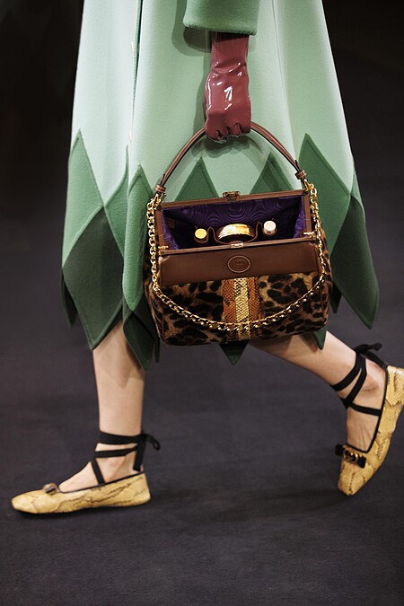 全新包還有這顆包口大開的手提包,刻意不闔上的隨興感,意外地讓包包的外層與內裡配色成為重點,再次展現Alessandro Michele天馬行空的創意。