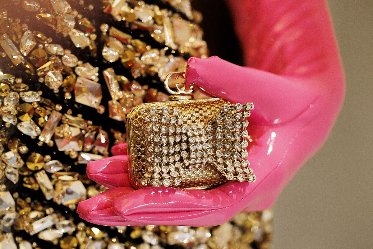 呼應繁星主題所誕生的水鑽小包,貴氣的金色網格包包,以斗大的水鑽蝴蝶結為主要裝飾,口金包的開口處綴以GG logo。