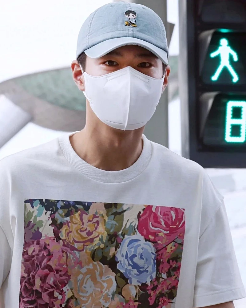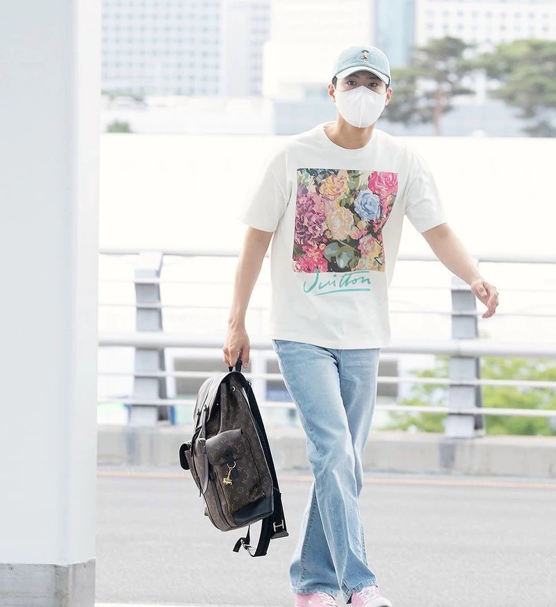 朴寶劍退伍後的首個海外活動,是來自LV的看秀邀請,他將出席6月1日在泰國曼谷舉辦的LV 2022秋冬大秀,朴寶劍一早在經紀人的陪同下,以印花T-Shirt和牛仔褲的休閒穿搭來到機場,手上拎得則是LV Christopher MM背包,輕鬆、隨性的穿搭風格,卻在腳上藏了小巧思,朴寶劍選擇Converse One Star粉色麂皮款為穿搭增添一抹亮點。