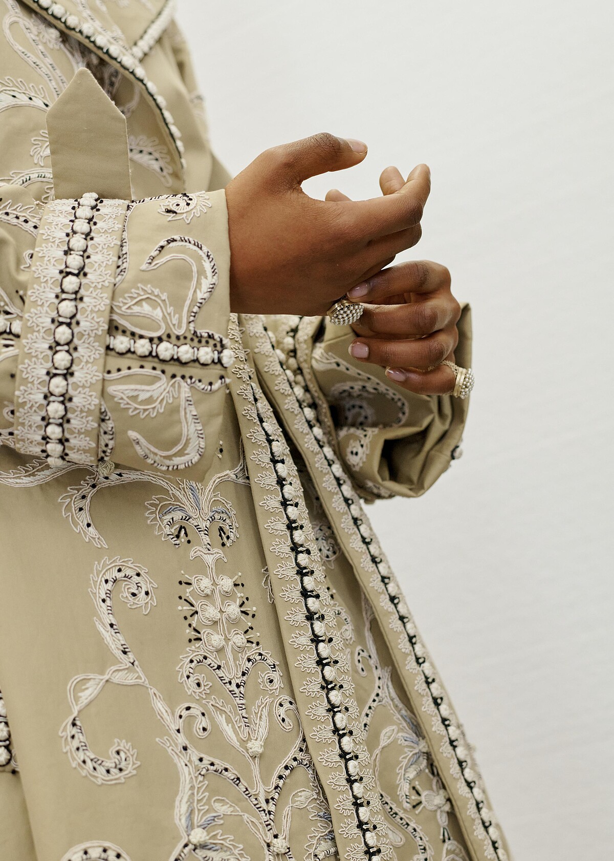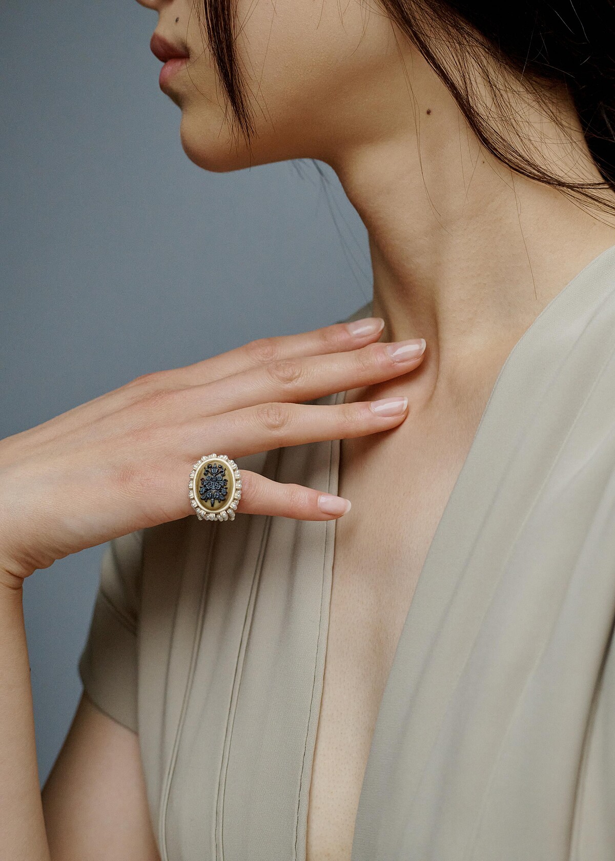 貫穿整場秀的刺繡工藝,延伸到手上的時髦配件,以珠飾串連而成的刺繡戒指,是不容錯過的亮點配飾。