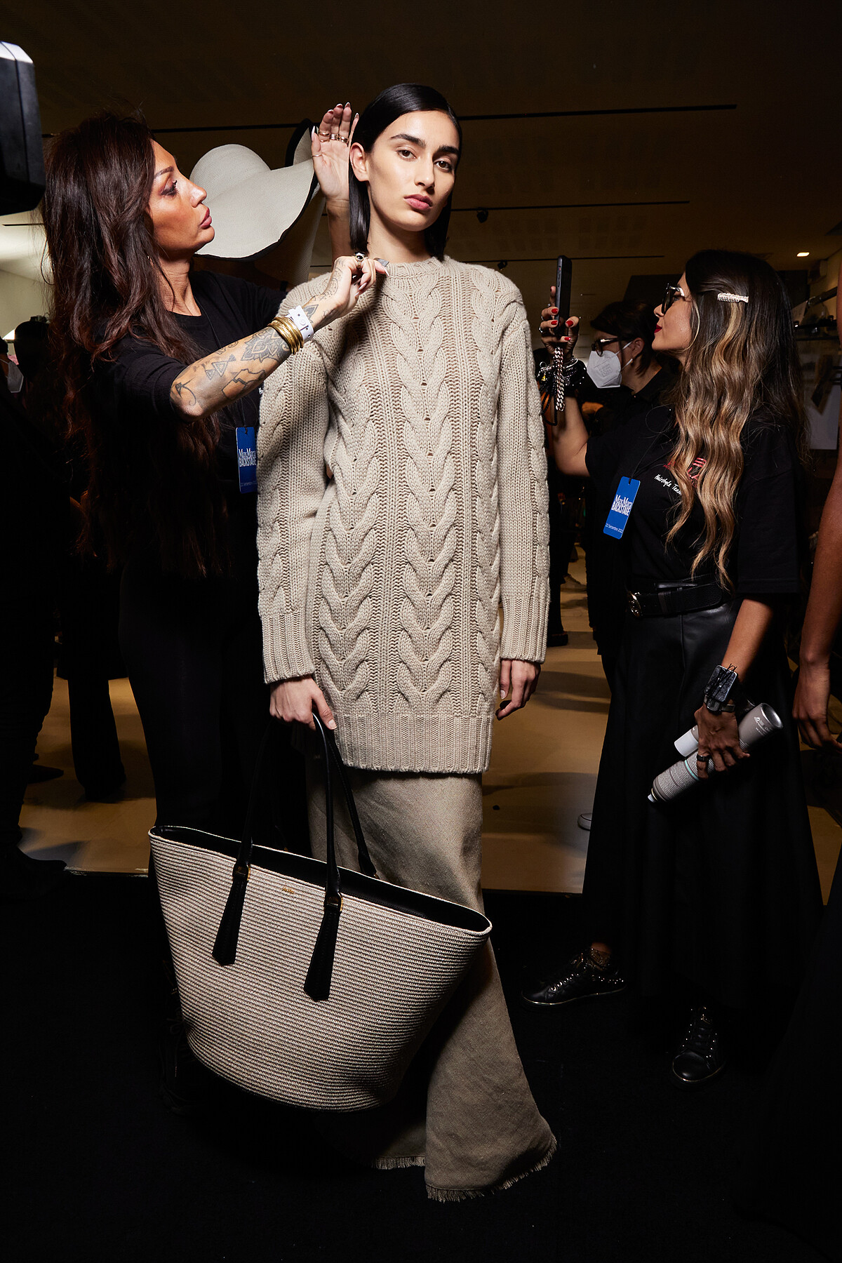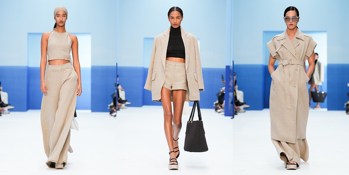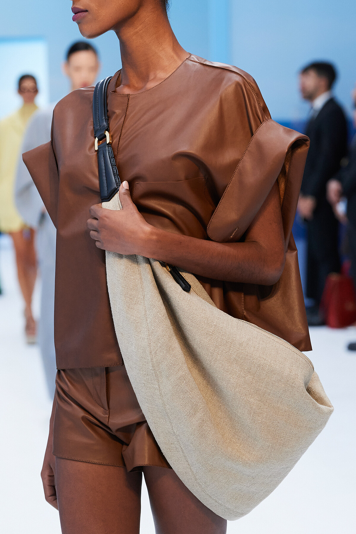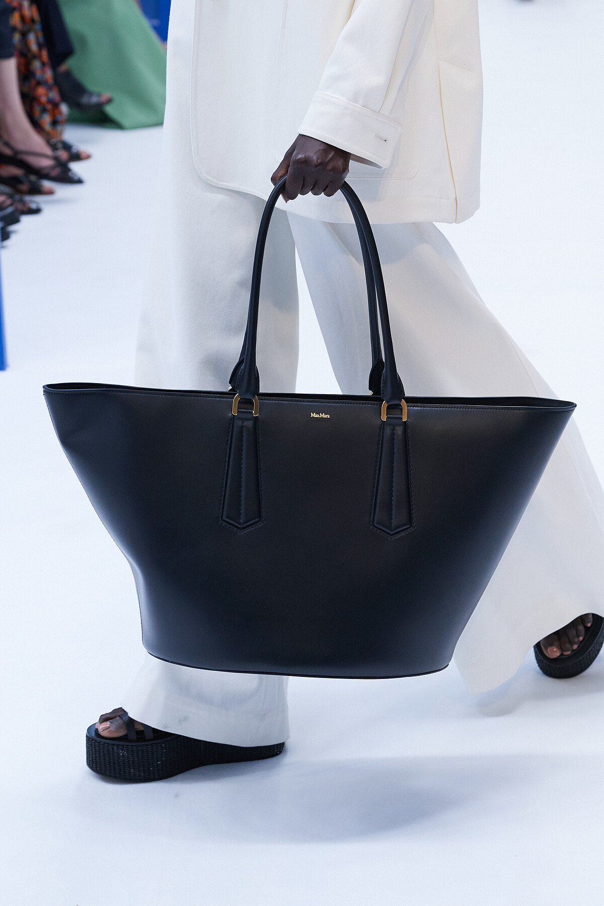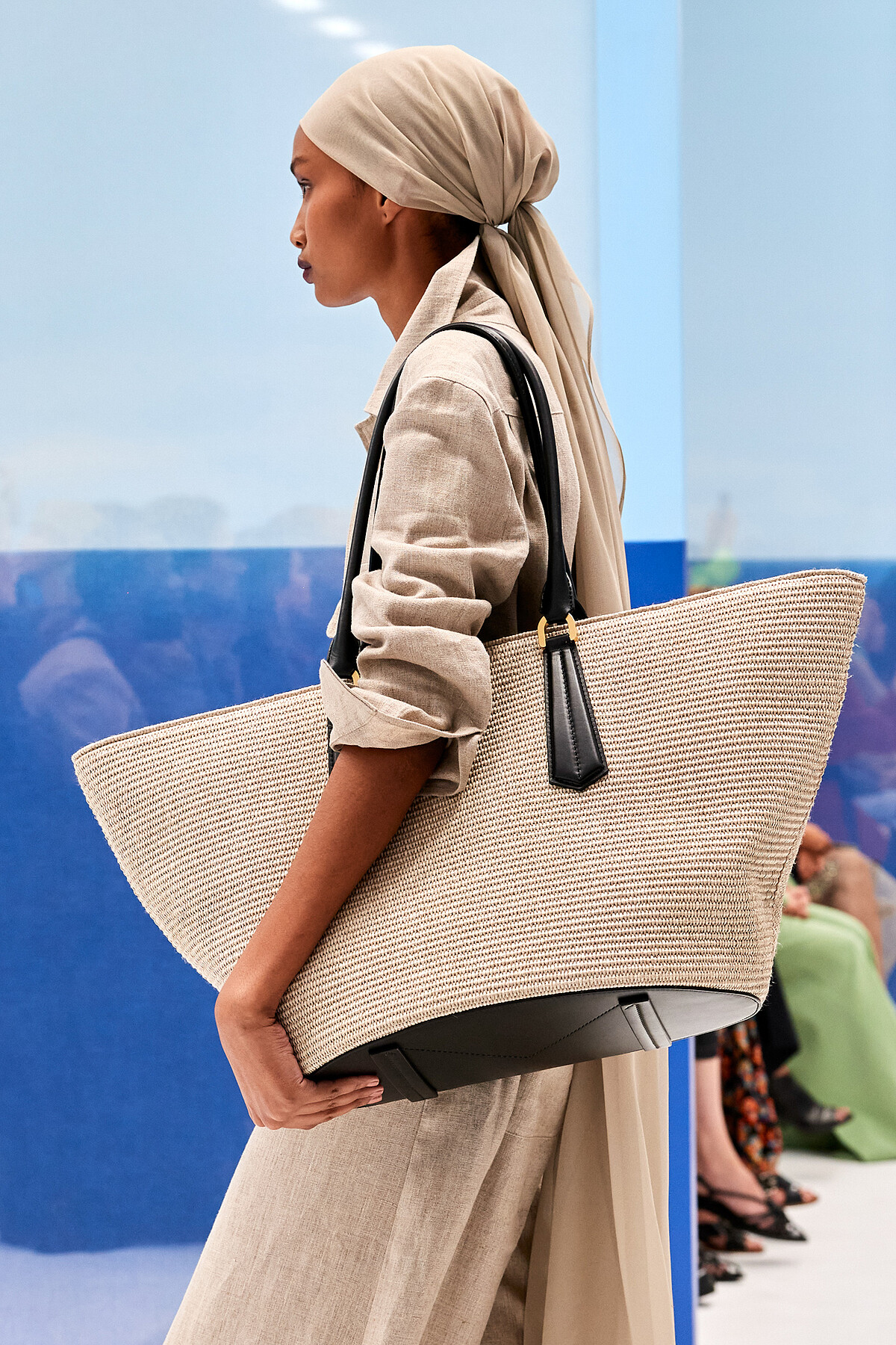 已然成為重點單品的大容量肩背包,在 Max Mara的秀上選擇以重點麻布做主題發揮,柔軟的沙色調輕倚身形的視覺印象深刻,與皮質背帶的結合,更有兩大謬思在沙灘相遇的想像。
