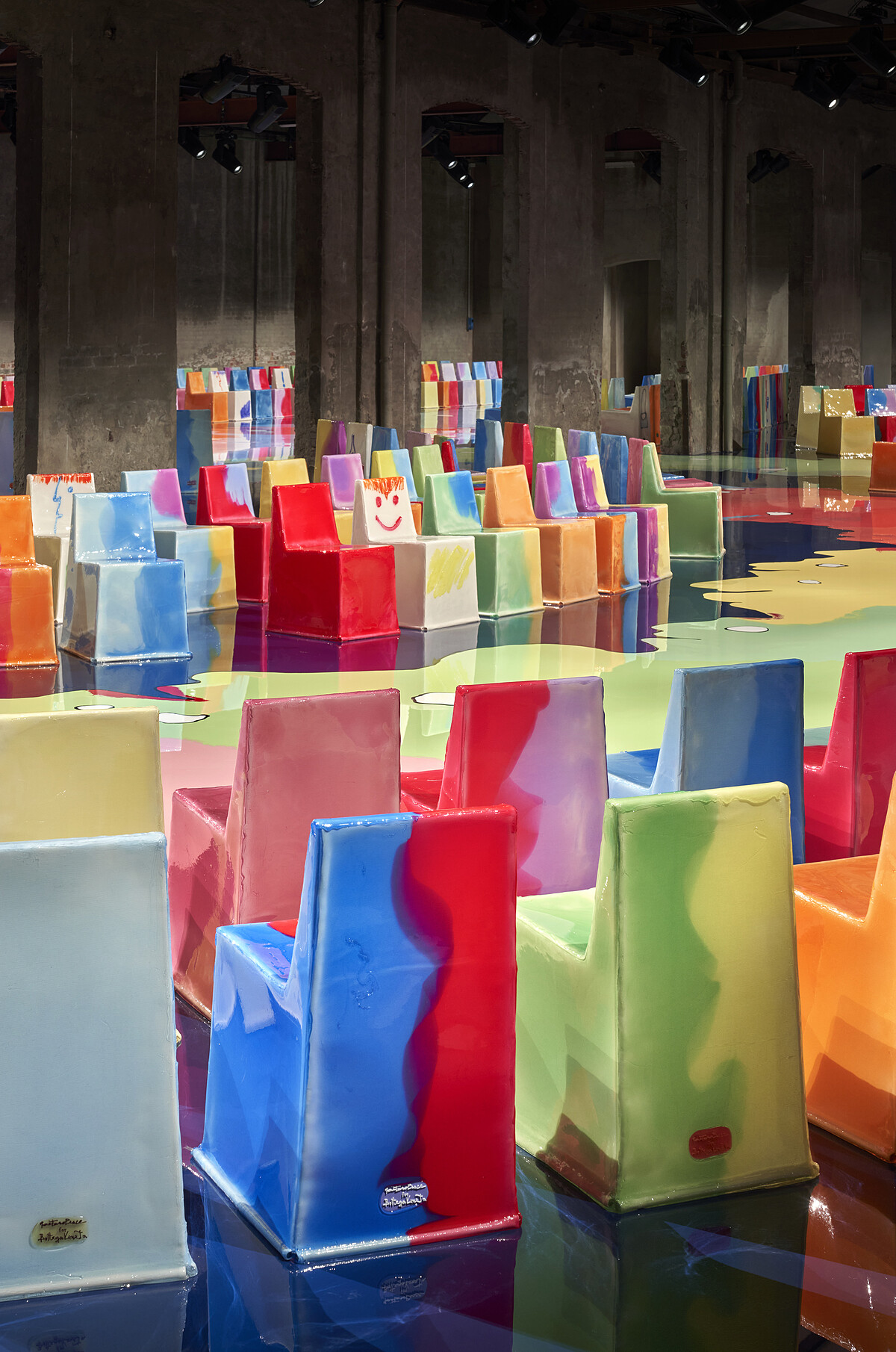 找上義大利建築大師Gaetano Pesce來打造發表會的佈置,除了繽紛的色彩直觀地帶給人雀躍的心情,大家是否注意到了每一張座椅都不太一樣呢?Gaetano Pesce解釋:「這是一個向多元包容致敬的空間。有人說我們都是一樣的,去他的!我們都是截然不同的,這也正是我們的特質;不然,我們就只是個複製品。你我都是原創,正如我的設計主題。」