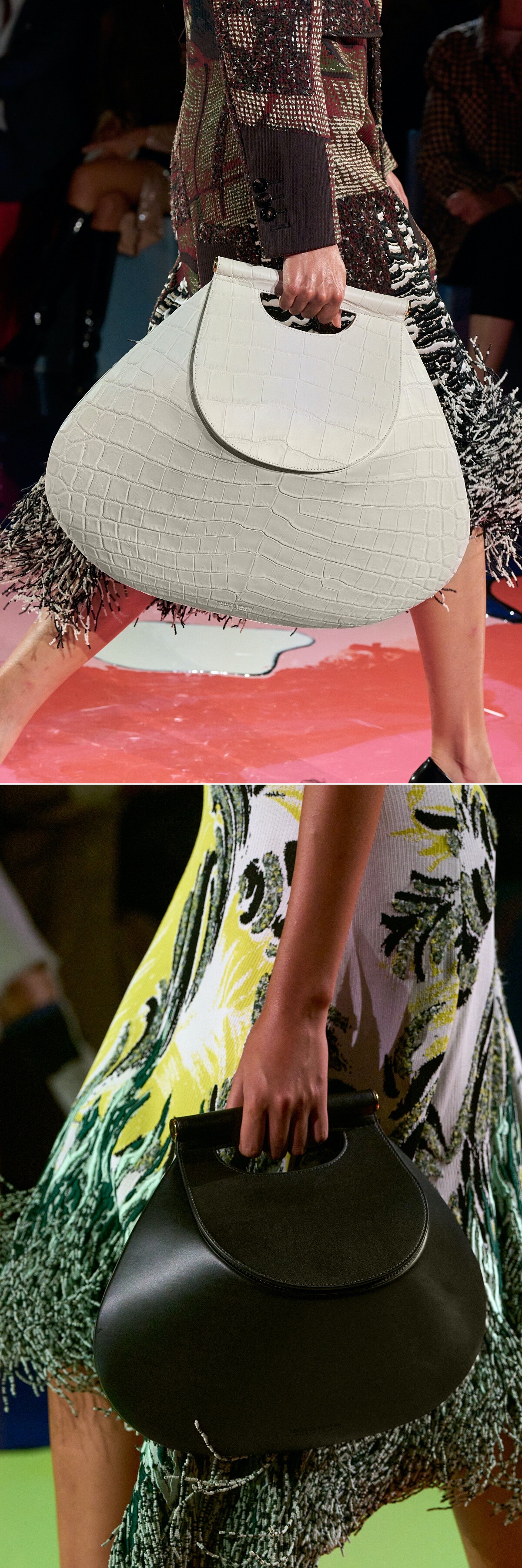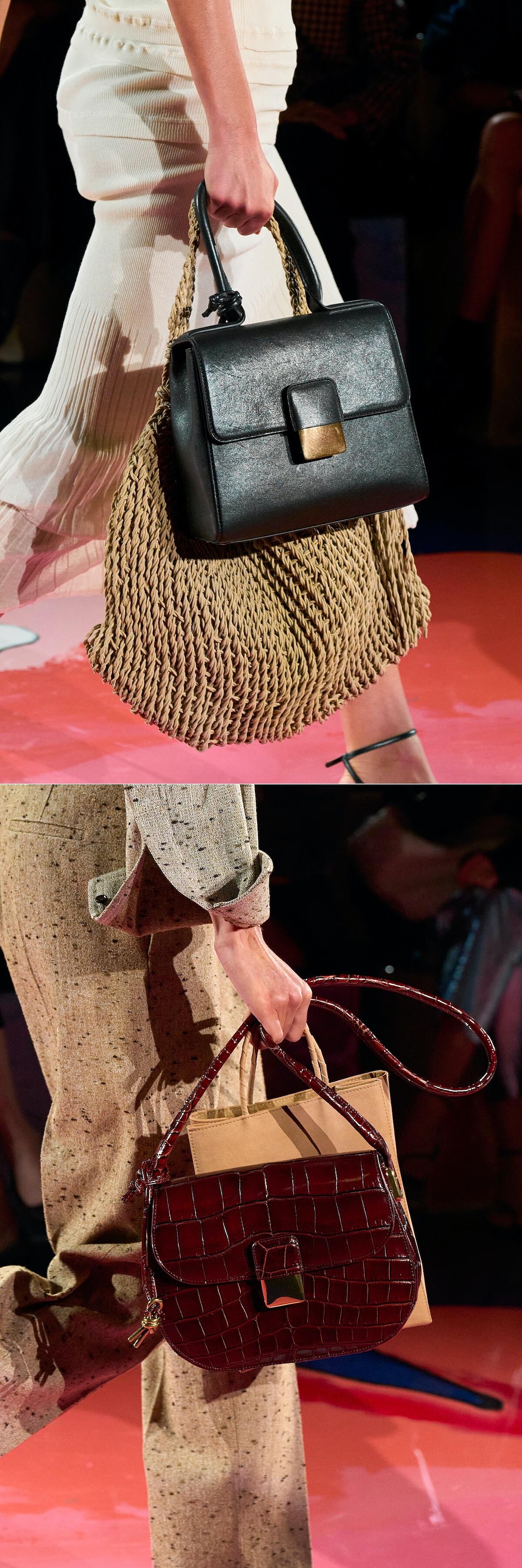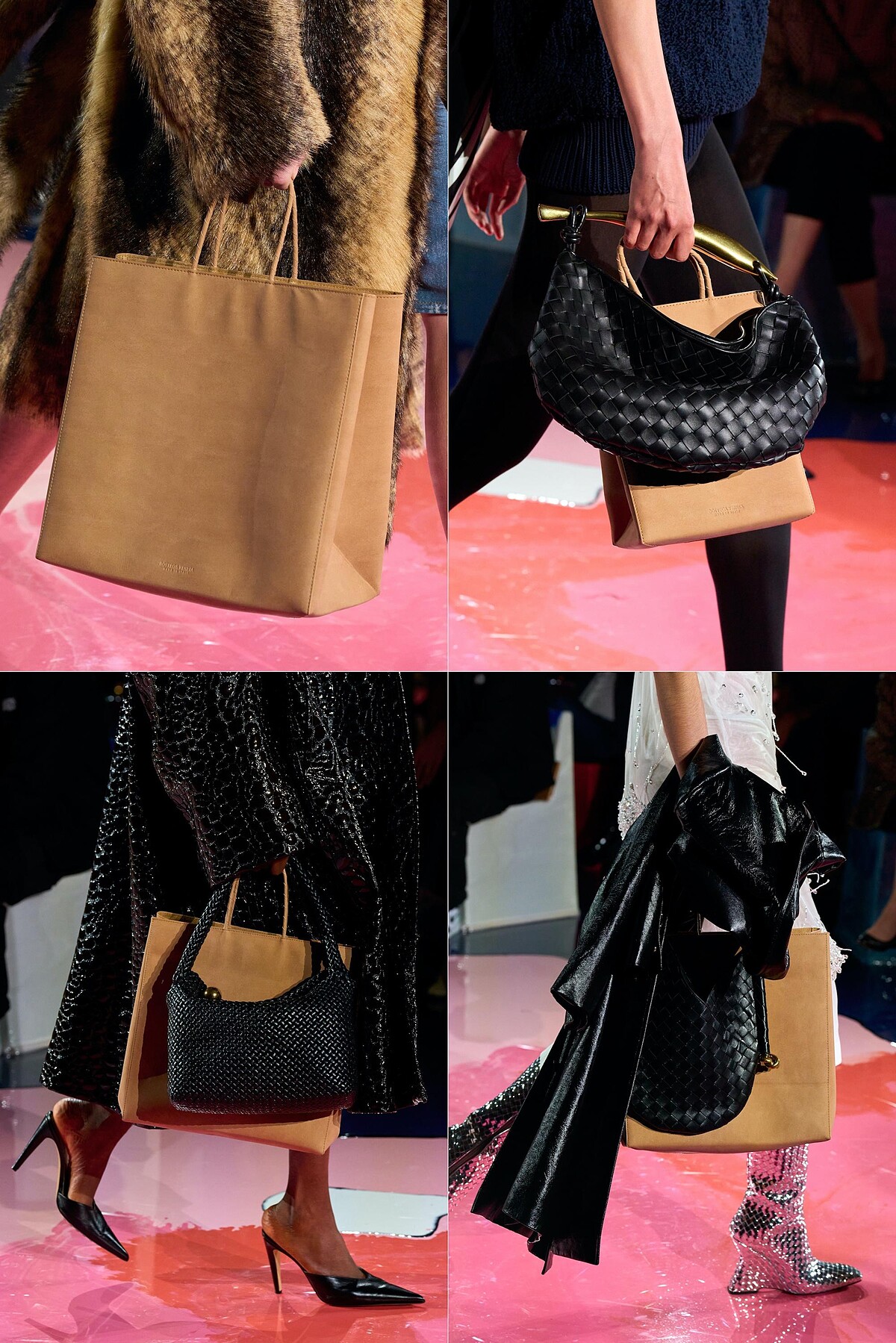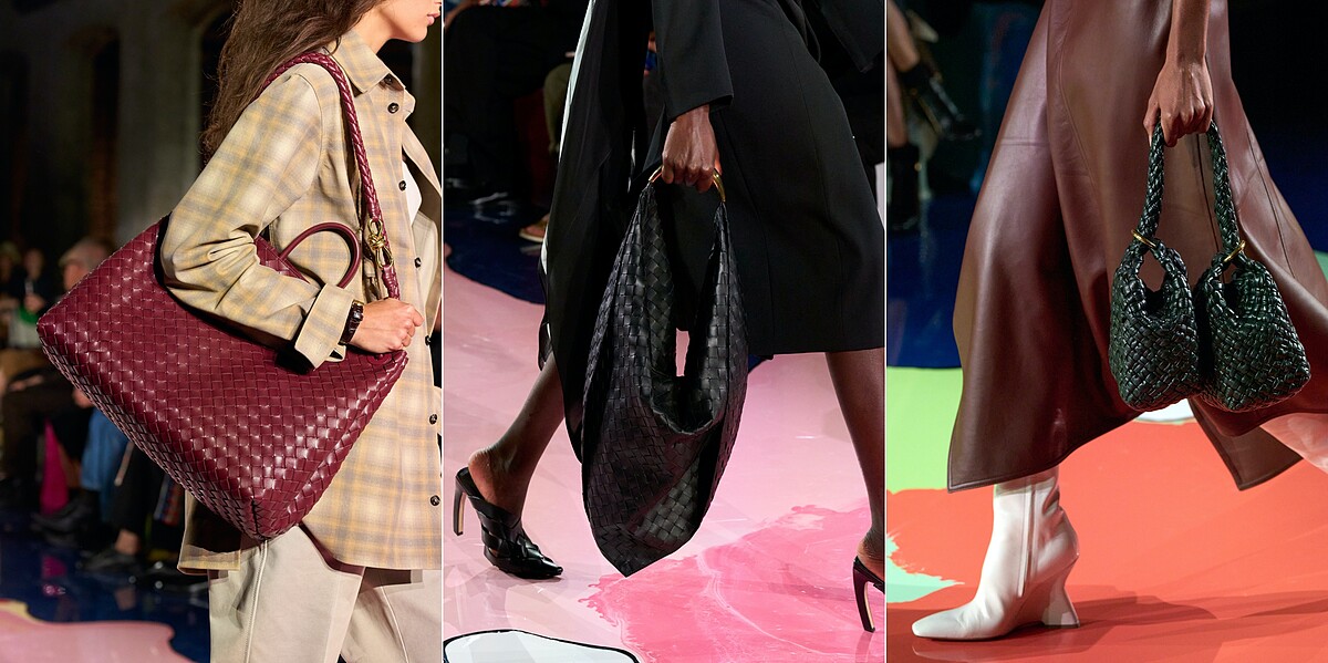 來到大家最有興趣的包包話題,說到Bottega Veneta,不管跟品牌的熟悉與否,一定都知道他們的編織強項!2023春夏不乏編織本色,新款編織包如(由左至右)Allez Hop托特包、Sardine手提變奏版、Kalimero雙水桶包的出現,更有非編織的包款登場: