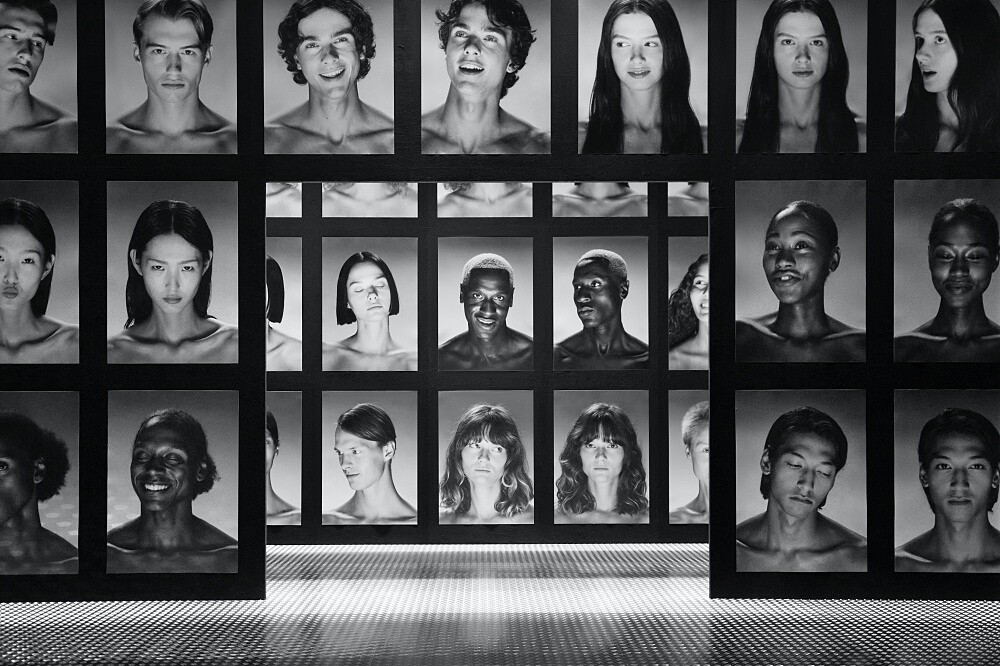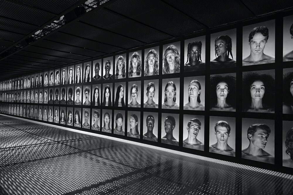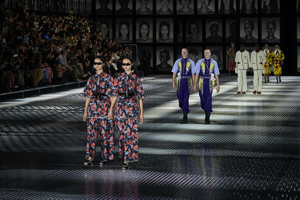 這一幕,相信不論是身在現場、或是隔著螢幕觀看直播的你,都能感到百倍、千倍的震驚,因為在佈景的另一頭,有著另一位穿著同樣服裝、鞋履、配件、甚至是面孔都長一樣的模特兒登場,而這場名為雙生之境Twinsburg的大秀正式進入高潮。