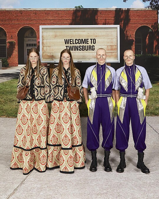 像是此次大秀的名字Twinsburg,來自俄亥俄州的特溫斯堡,此處又稱為雙胞胎城,每年8月登場的雙胞胎節,吸引來自世界各地的雙胞胎共襄盛舉,就連此次大秀的形象照,都是以Twinsburg特溫斯堡作為背景。此外,穿插在大秀上的亮點角色-小精靈,遇水就會繁殖的特性,是Alessandro Michele為了呼應主題隱藏在其中的小巧思。