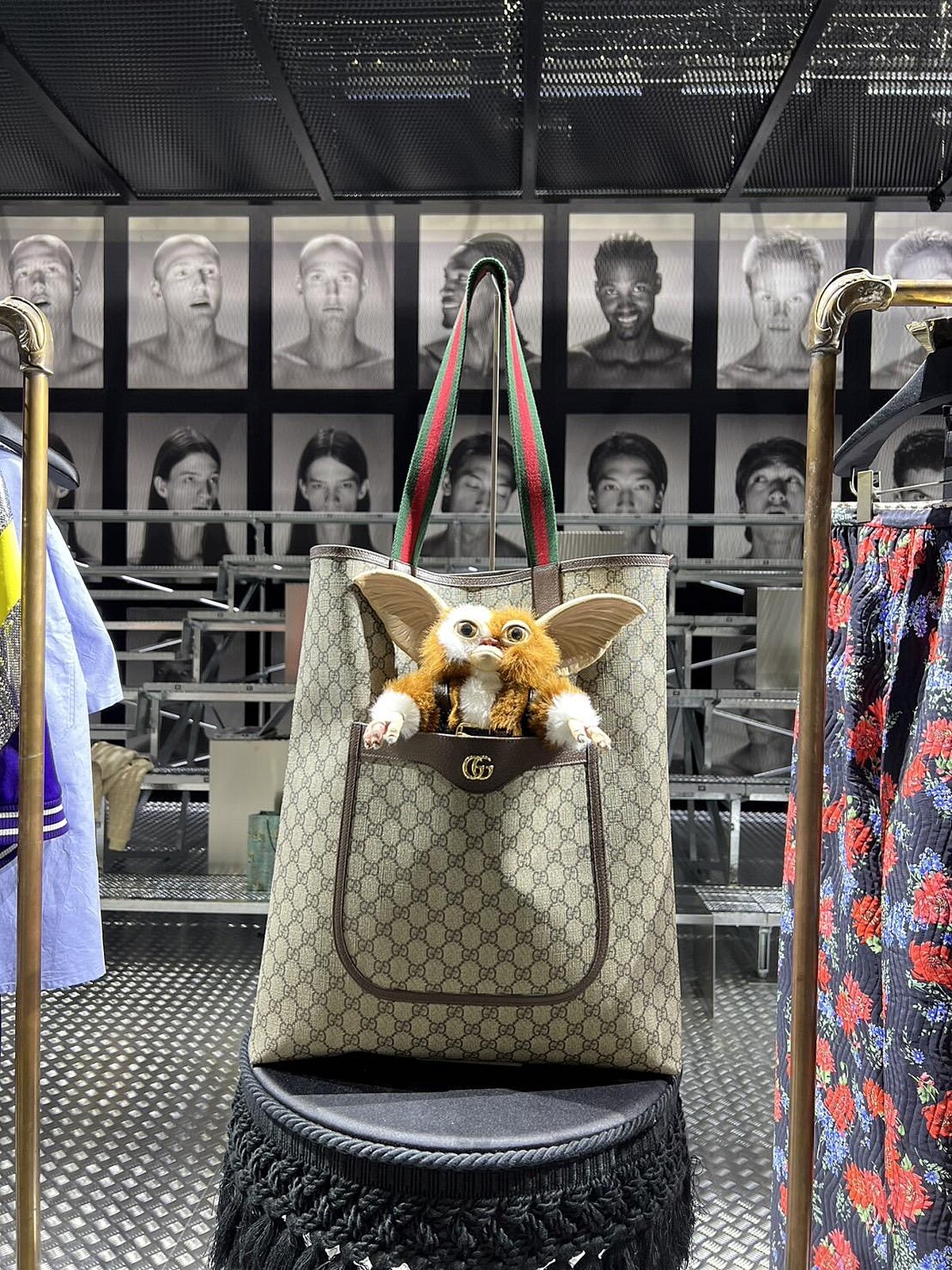 有小精靈加持的滿版GG Logo托特包,肩帶是Gucci最具代表性的雙色織帶。