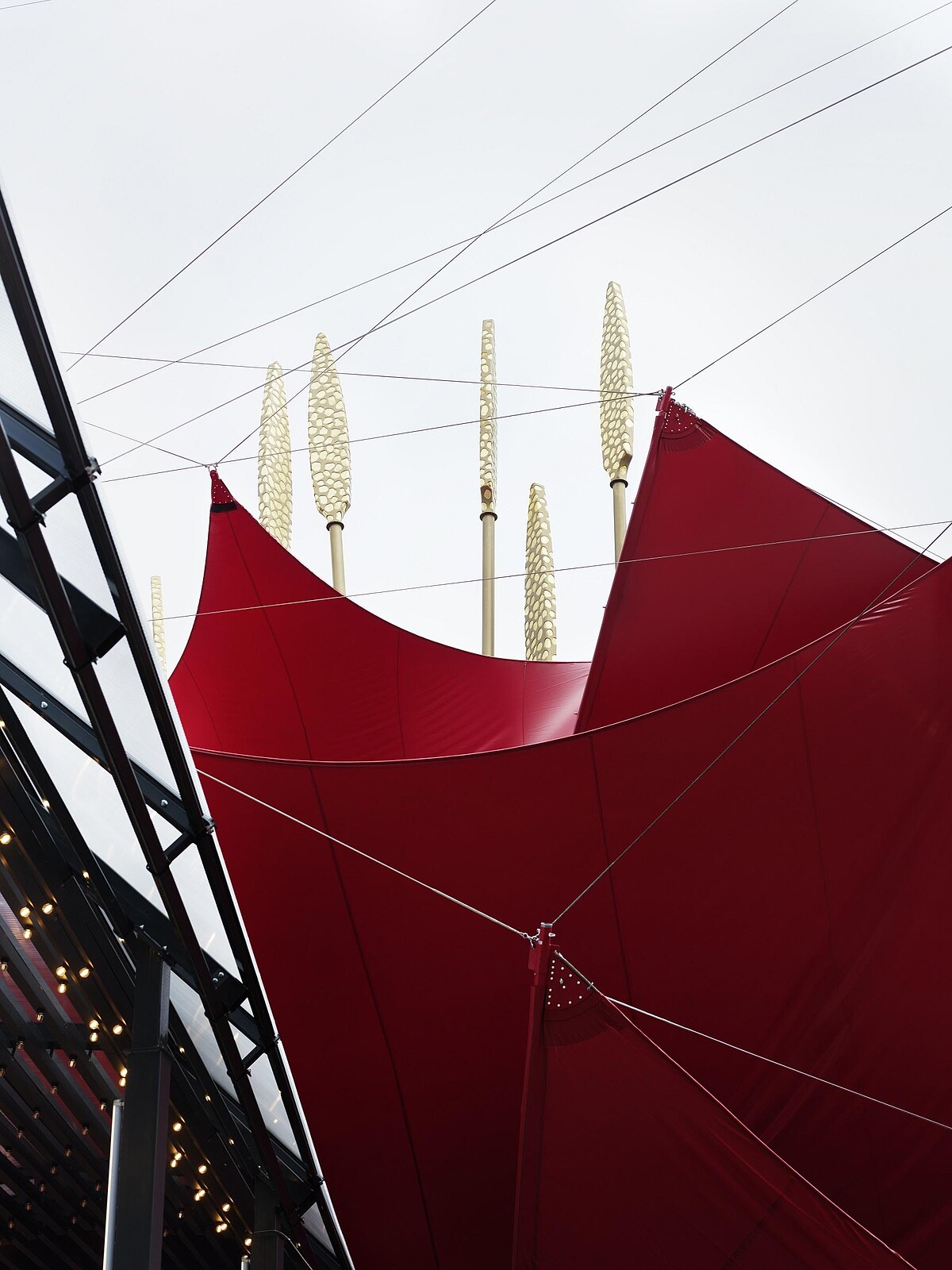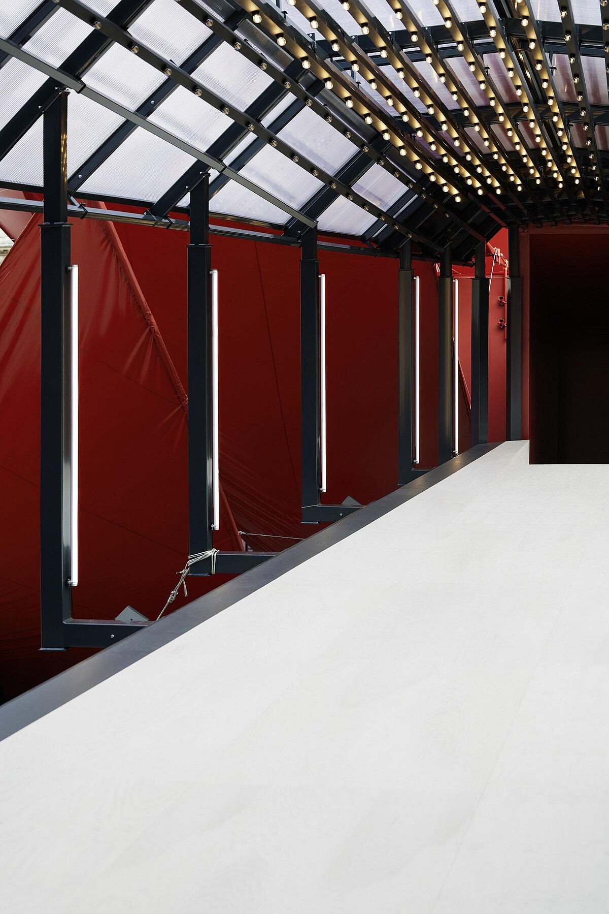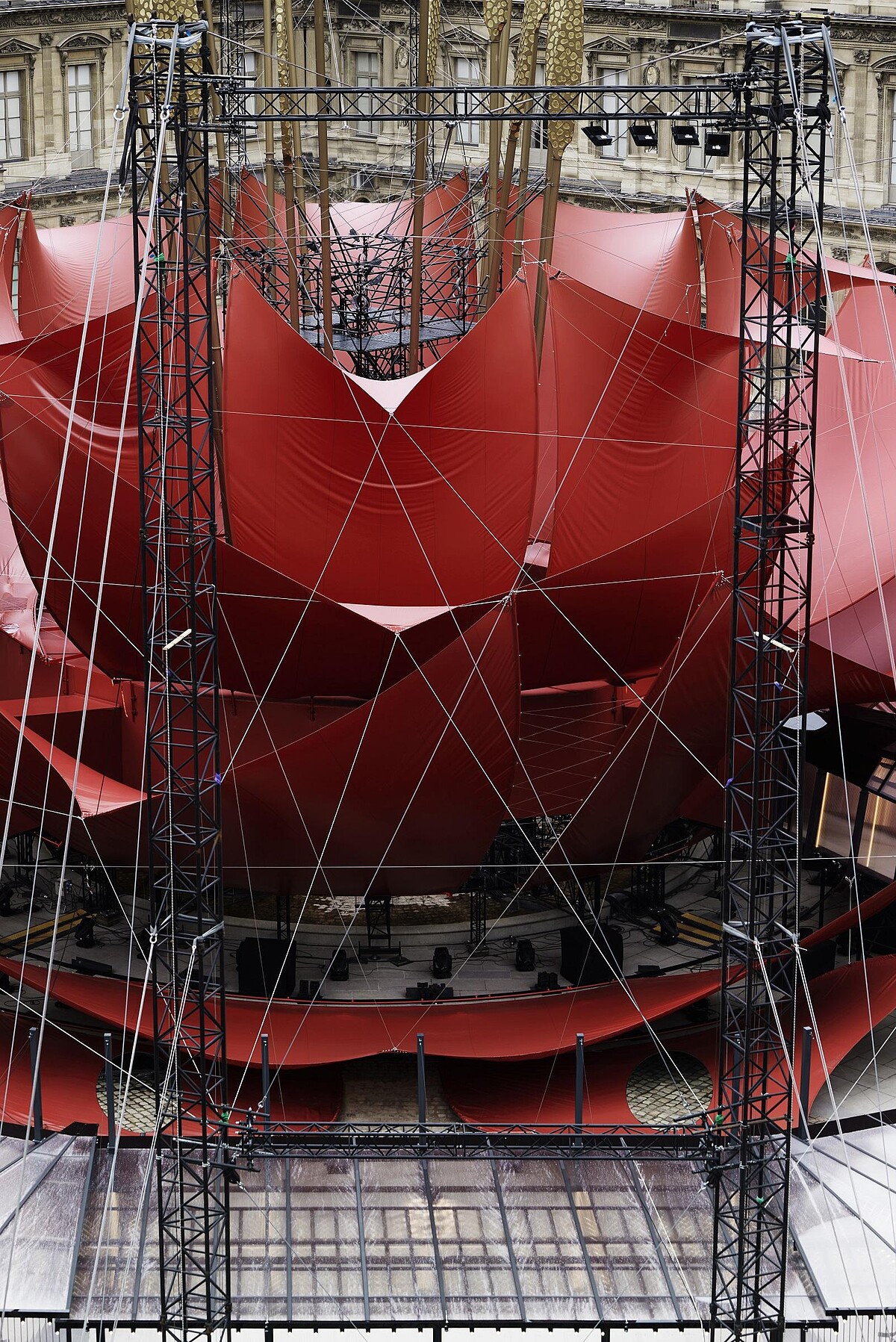 如前言所述,本次 Louis Vuitton 攜手藝術家 Philippe Parreno、美術指導 James Chinlund 製作了以「紅色花朵」貫穿秀場的雕塑主體,紅與白的色調大氣時髦,為眾人帶來一場氣勢十足的視覺饗宴。
