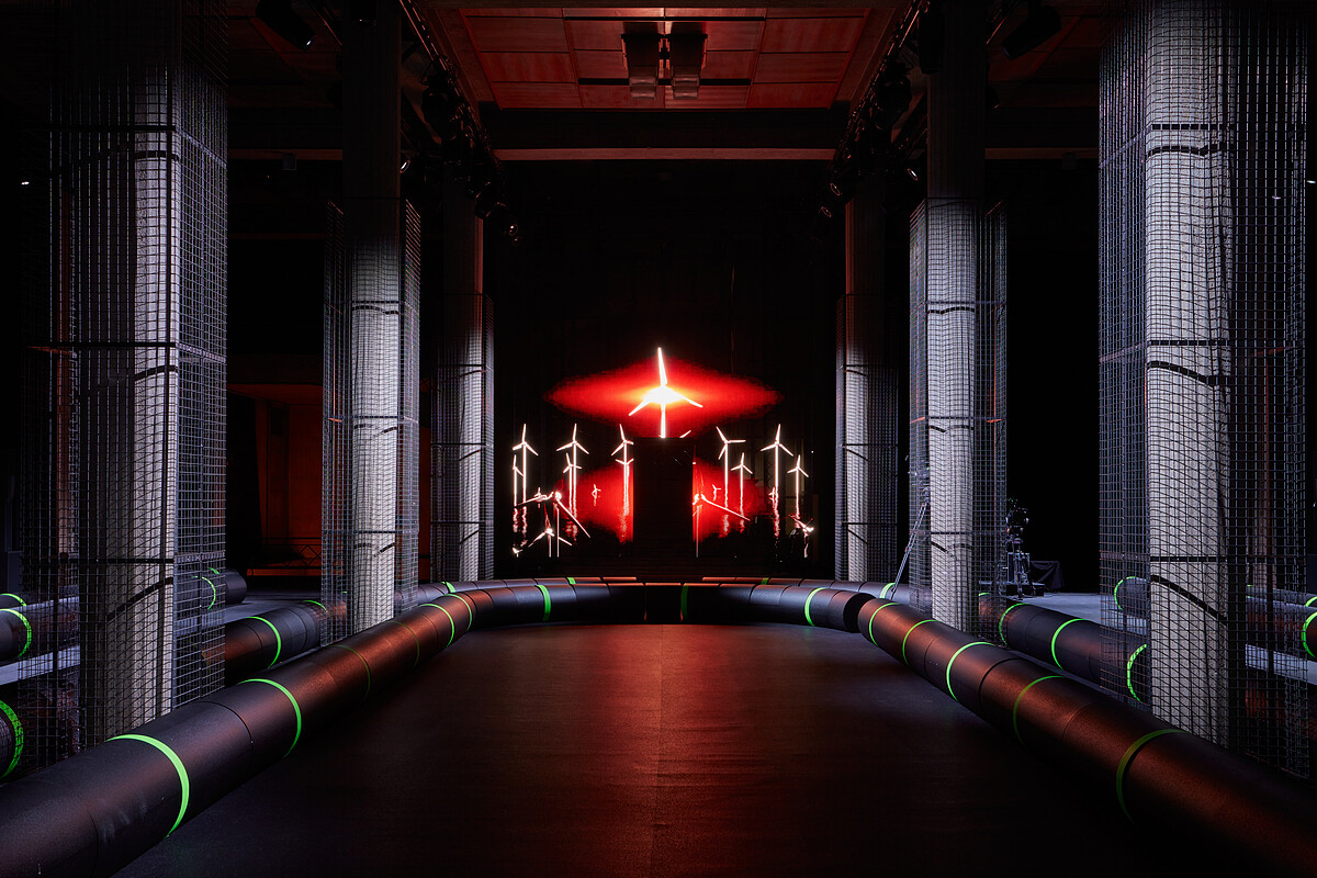 選址在巴黎的耶納宮(Palais d’lena),Miu Miu找上中國藝術家Shuang Li攜手打造此次的秀場。閃爍光圈的投影畫面,為現場蒙上一層迷幻的未來氛圍;座椅的部分也相當特別,黑綠相間的線條則是擷取日常我們完全沒機會看見,卻分分秒秒都都靠它傳遞網路訊息的海底電纜!