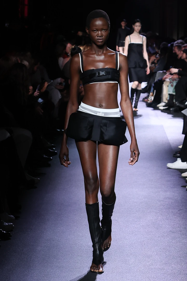 繼先前2022秋冬系列的炫腹套裝,透過2023春夏,Miuccia Prada宣告Y2K的穿搭風潮會持續延燒,加上了機能扣的細肩帶抹胸和低腰短裙的搭配,看來今年秋冬忌大口喝酒、大口吃肉,以好維持苦練已久的腹肌曲線。