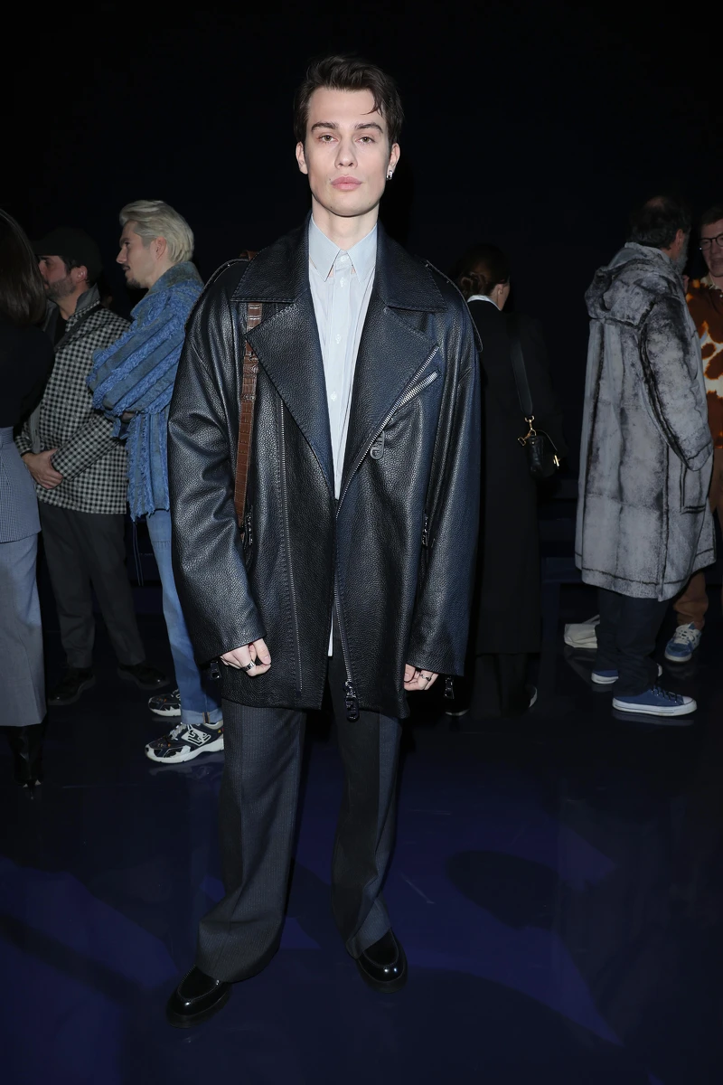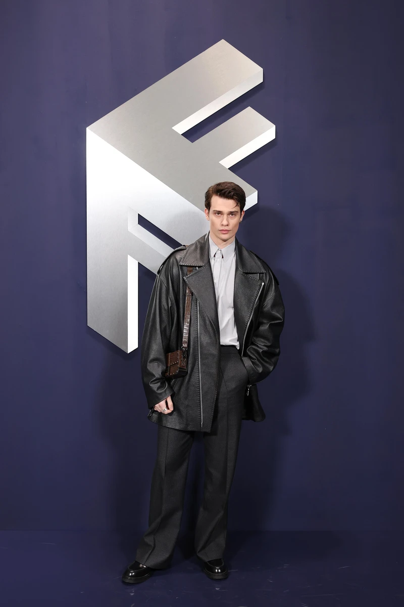 因為電影《紫心愛戀》知名度大增的演員尼可拉斯葛拉辛,成為Fendi 2023秋冬男裝秀的座上賓,身著灰色襯衫、西裝長褲和黑色皮衣夾克引發粉絲們熱烈討論。